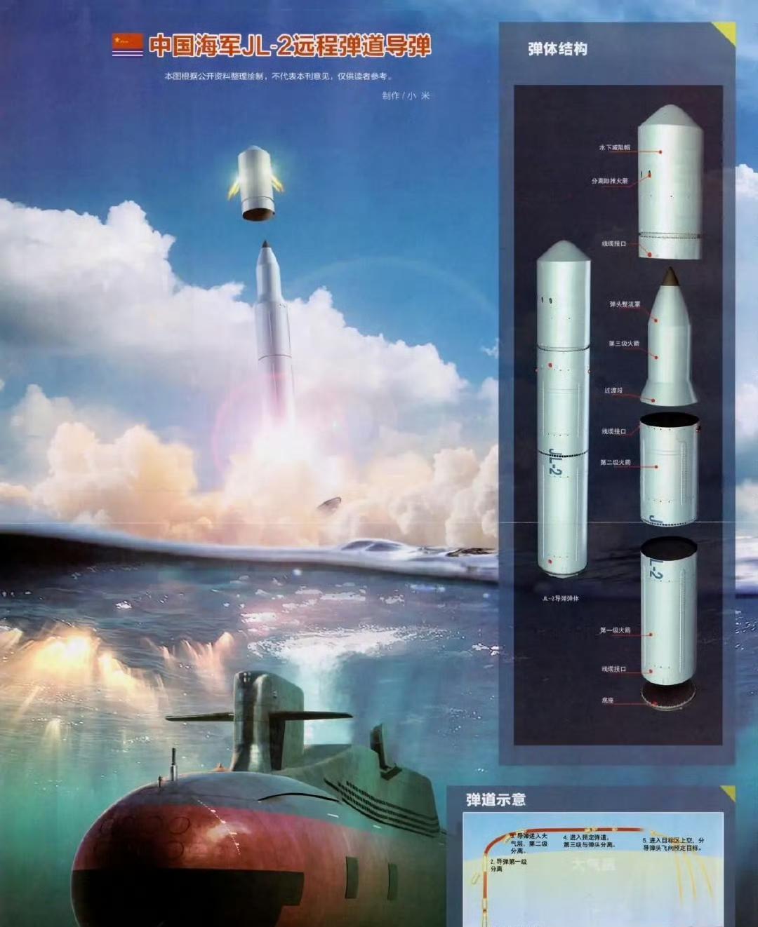 巨浪-2和巨浪-3,从外观看没有任何变化。 发射筒的尺寸一模一样,线缆槽和检查口的位置也没有变化,说明巨浪-2和巨浪-3的结构是一样的,都采用可分离的钝头整流罩,导弹尾部还有可抛弃的大底。 可以推测,巨浪-3只是巨浪-2导弹的改进型,更换了新型壳体材料和先进燃料,解决了巨浪-2射程不足的短板,其他的没有变化。 据几年前(2020年)官方“水下发射大型固体运载火箭研制团队”先进事迹透露,巨浪-3导弹的优势是“投送距离世界第一”,说明射程至少有12000~13000公里,打到地球另一面的花生屯是没问题的。 至于传说中的可伸缩式减阻杆,可能要到巨浪-4才能实现。