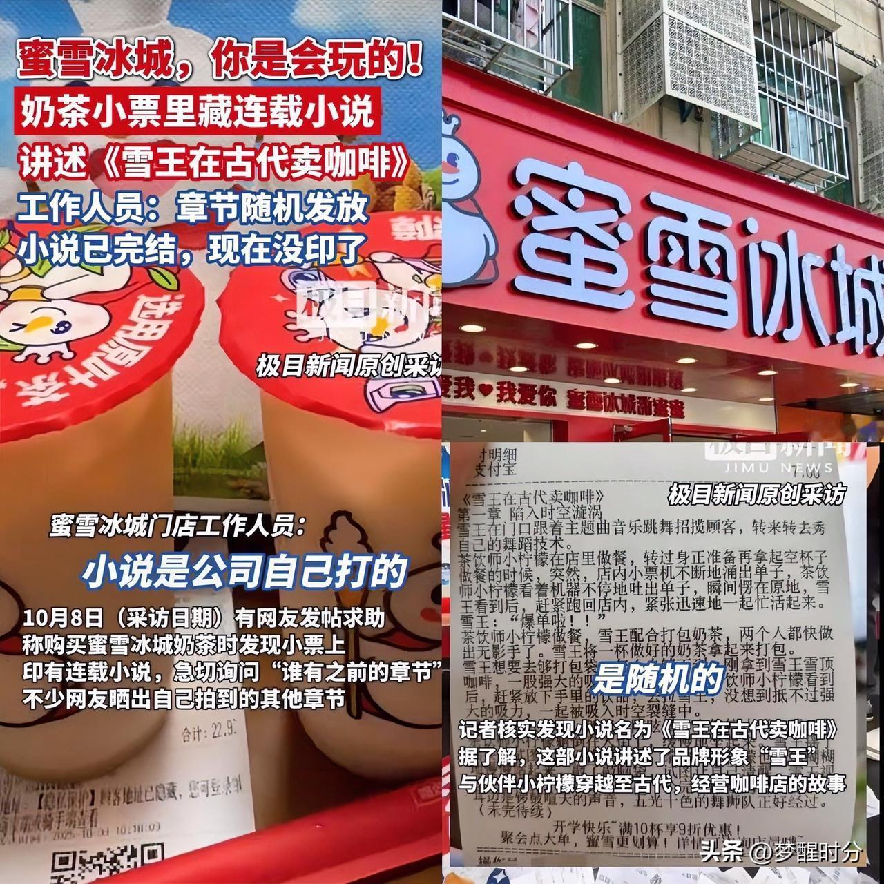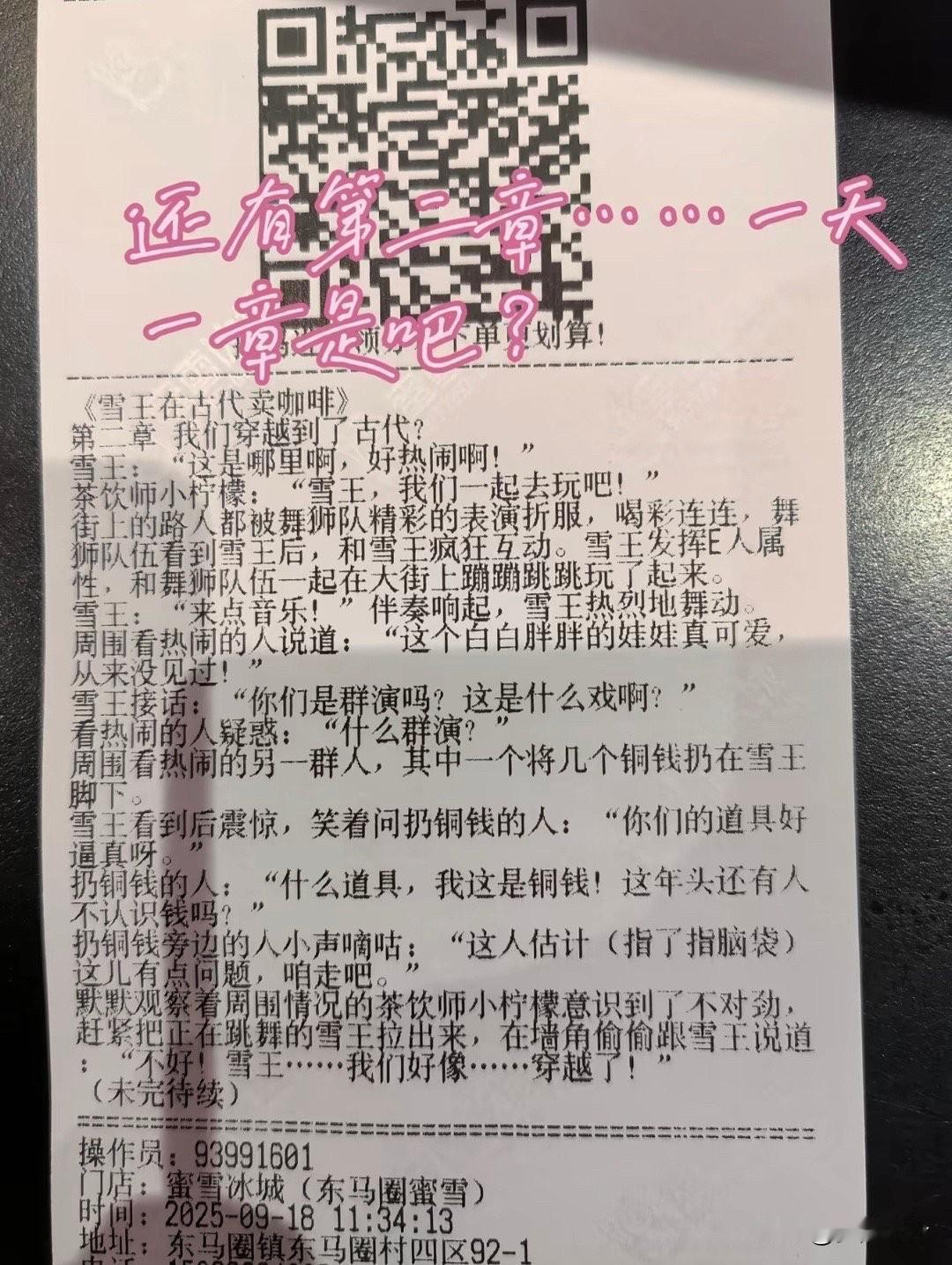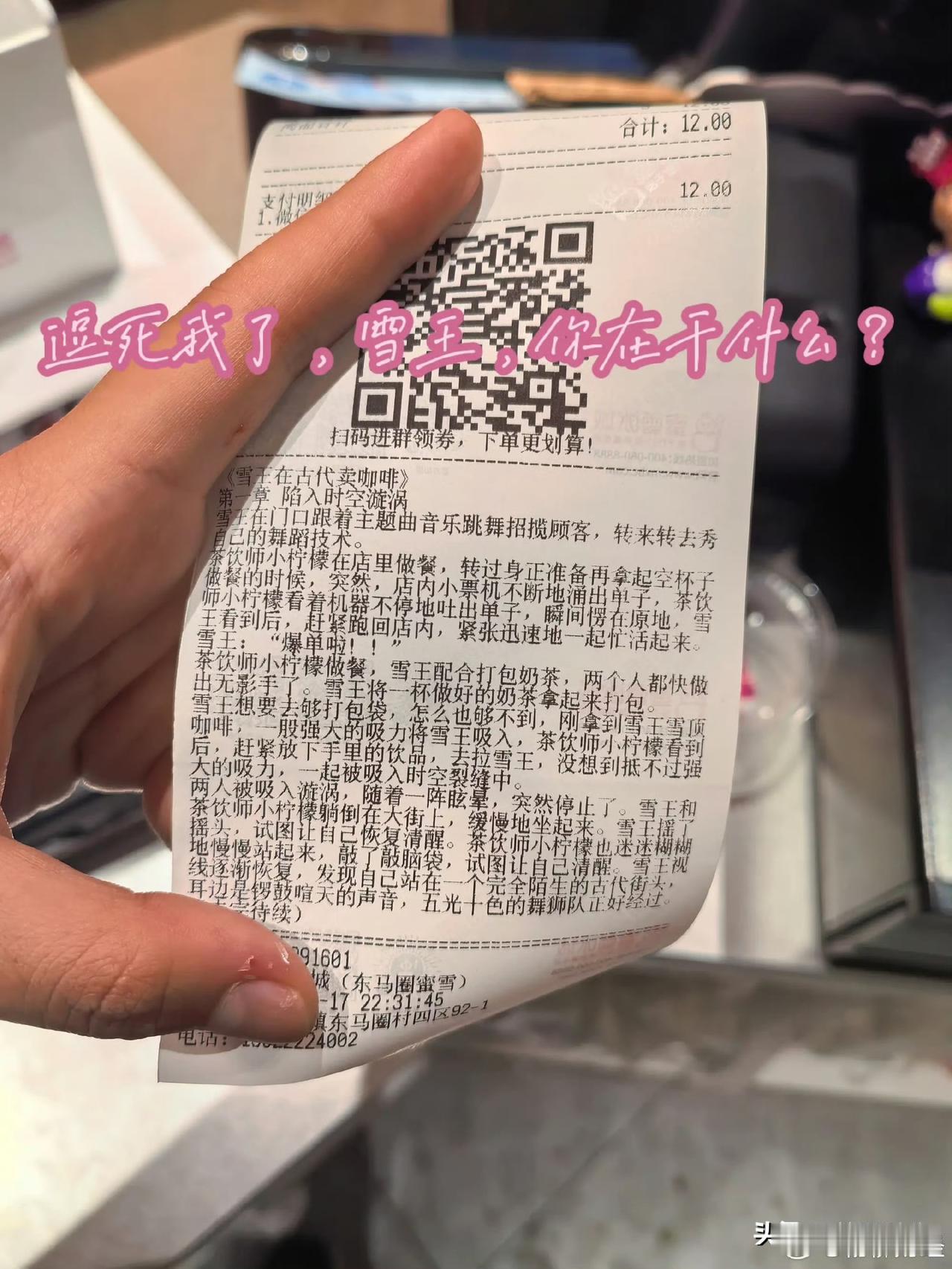 雪王拍短剧,我知道 雪王卖啤酒,我也知道 现在雪王居然开始出连载小说了,不得不服太会整活了! 每张小票都印有连载小说《雪王在古代卖咖啡》,章节随机发放,引发全民集邮热潮,大家都开始拼小票看免费小说。 谁能想到,一个不起眼的小票,被雪王玩出了新高度,里边竟然暗藏玄机,不得不说,雪王还是个营销鬼才! 有人说,也太划算了,以后买一杯4米的柠檬水还能看会儿免费小说,这花得值啊。 也有人说,这比广告还有效果,将闲置小票转化为互动载体,结合碎片化阅读与盲盒心理,刺激更多人复购。 目前国内奶茶品牌众多,但像雪王这样会整活的,还真是独一份。 大家觉得呢?