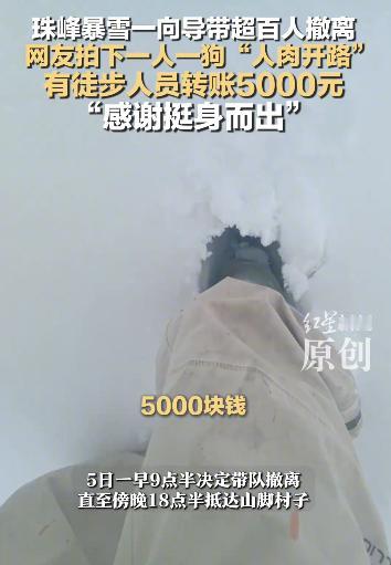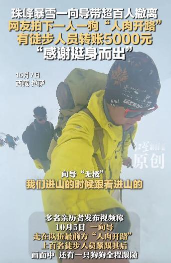 “太暖心了!”西藏珠峰突发暴雪,一向导冒“死”带百余人雪中撤离,还把狗派到前面带路,历经9个小时才安全抵达山下。没想到,一徒步队员夺过他的手机当场转账5000元,网友直言:这钱花得值,其他人呢? 撤离时回头望,那人和狗还在风雪里扒帐篷,雪都埋到腰了…… 10月5日,获救游客在微博发的这句话配着模糊视频,瞬间戳中无数人。 视频里,珠峰东坡的白色风暴中,一个身影正弯腰拍打帐篷残骸,旁边黄狗的尾巴在雪雾里若隐若现。 这张被转发数万次的画面,定格在2025年10月4日那场罕见暴雪里,谁也没想到,秋高气爽的登山旺季会突然变成生死考验。 这场被央视新闻称为“近年同期最强”的暴雪来得毫无征兆。 10月4日中午,珠峰东坡嘎玛沟还飘着细雨,午后突然狂风卷着鹅毛雪砸下来,能见度瞬间跌到不足1米。 到了次日凌晨,40厘米厚的积雪压垮了大半帐篷,近千名游客被困在海拔4900多米的营地,有人已经开始出现失温症状。 在专业救援力量向深山挺进时,土生土长的当地向导无极,已经带着一支百余人的队伍踏上了最险的撤离路。 干了十几年向导的他,连资深同行都直言,从没见过这么大的雪。 他走在队伍最前面,每一步都要把雪踩实再往前挪,齐腰深的雪坑让他每迈一步都要喘半分钟。 更让人动容的是他身边的黄狗,那是进山时跟着队伍的流浪狗,此刻正鼻子贴地闻路,时不时跑到前面扒开积雪确认地形,尾巴冻得僵硬也没离开半步。 撤离从早上9点半持续到傍晚6点半,9个小时里没人敢停下脚步。 雪地里最怕迷路,而向导无极总能凭着记忆找到隐蔽的路径,他知道哪些凹地容易积雪,哪段山路背风能短暂喘息。 中途休息时,向导无极没顾上喝口热水,反倒挨个摸队员的手,发现谁手凉就把人往队伍中间挪。 当队伍终于看到山脚接应的大巴灯时,有人回头发现,向导无极正逆着人流往回走,黄狗紧紧跟着,他要再确认没有遗漏的人。 抵达安全地带的瞬间,一名队员突然冲上去夺过无极的手机,手指在结冰的屏幕上戳了半天,转过去5000元。 “给开路的几个领队分着花!”队员声音沙哑,眼眶通红。 向导无极愣了愣,黝黑的脸上露出局促的笑,我就是做了该做的事,带人上山就得带下山。 这句朴实的话被传到网上,很快引发热议。 有网友留言,这钱买的是命,向导和狗都是英雄,也有人追问“其他人呢? 其实不用问,现场已有游客默默给无极塞暖宝宝,牧民赶着牦牛送来热甜茶。 这场救援里,没人是旁观者,定日县消防110名救援人员连夜进山。 其中50人是从日喀则紧急增援的,他们背着供氧设备在雪地里跋涉,凌晨还把一名肺水肿游客背到安全地带。 五辆大巴车冒雪开到沟底接应,救援人员益西说“物资早备足了,就怕人冻着”。 就连商业团队的领队们,前一晚都没合眼,每隔一小时就给游客的帐篷扫雪,“再晚半小时,帐篷就全塌了”。 网友追问的“其他人呢”,其实藏在每一个温暖的细节里。 是无极逆行时的脚步,是黄狗不离不弃的守护,是队员转账时的坚决,也是救援人员冻得发紫的双手。 这场暴雪让所有人明白,户外安全从不是靠“征服自然”的勇气,而是像无极说的“把责任放在心上”。 而网友的热议还在继续,有人说得好,这钱花得值,因为它买到的不仅是平安,更是绝境里人与人、人与动物之间最真的善意。 珠峰的雪会化,但这些温暖的瞬间,会永远留在每个亲历者心里。 但也给所有户外爱好者敲响警钟:真正的勇敢,是带着敬畏前行,带着责任回家。 信息来源:三湘都市报2025-10-05发布:珠峰东坡暴雪上千人被困,积雪过深救援难度极大,当地呼吁:暂停行程、关注景区通知 红星新闻2025-10-08发布视频