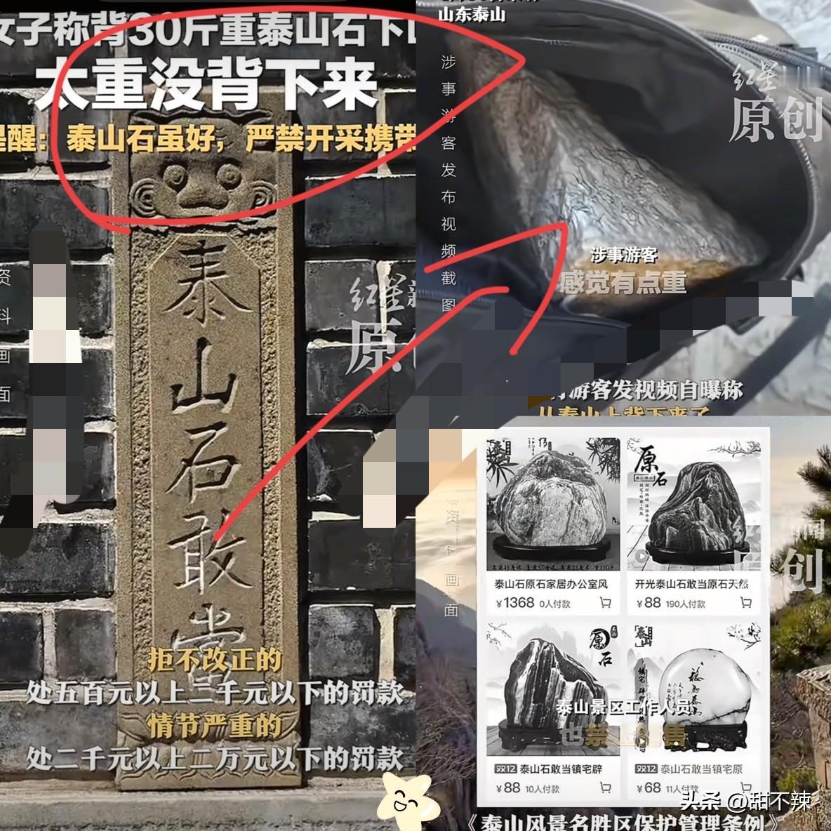 在山东泰安,一女子在泰山游玩时突发奇招,把一块重达 30 斤的泰山石塞进背包,打算带下山,结果刚走两步就累得直喘! 最后只能蔫蔫地把石头放回去。网友调侃这哪是“泰山石敢当”,分明是“泰山石把人难住了”,这话一出来,谁看了不乐两声? 但玩笑归玩笑,有个关键信息必须说透,泰山石早就禁止游客私自带走了! 真要硬来,轻则罚款还得自己把石头扛回山顶,重则可能涉及刑事处罚,这可不是闹着玩的! 至于“带泰山石招霉运”的说法,没什么实在依据,可破坏景区规定、拆损自然风貌,这事本身就不地道! 再说了,不管是泰山的石头,还是长城的砖,它们留在原地才有意义。既能保住景区的原样,也能让后来的人都看到这些自然或历史的痕迹! 要是人人都想“揣一块当纪念”,再好看的地方,也得被折腾得没了样子! 规定是不能把泰山上的石头带下来,但可以把其它地方的石头带到泰山拍完照再带回呀!