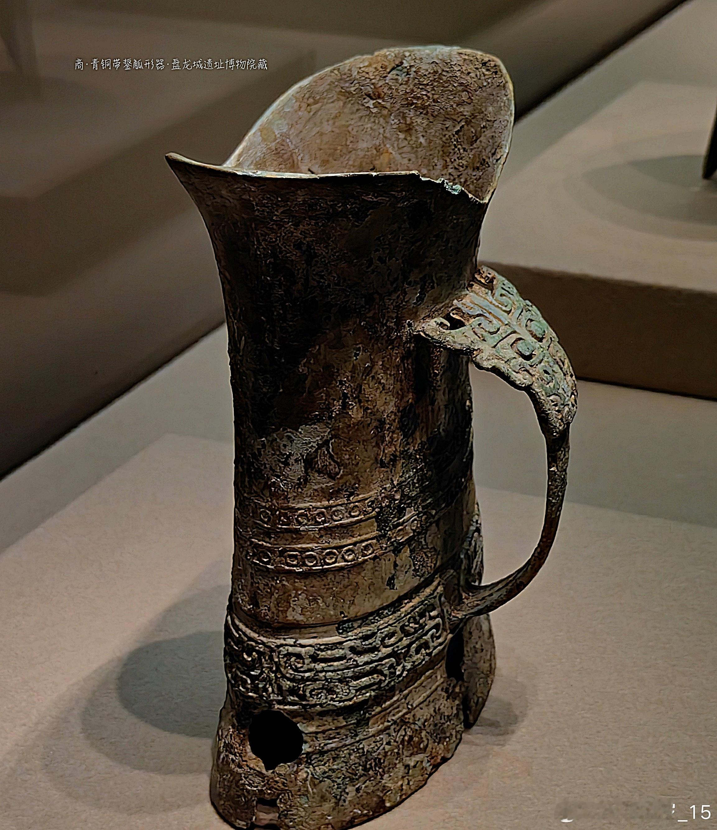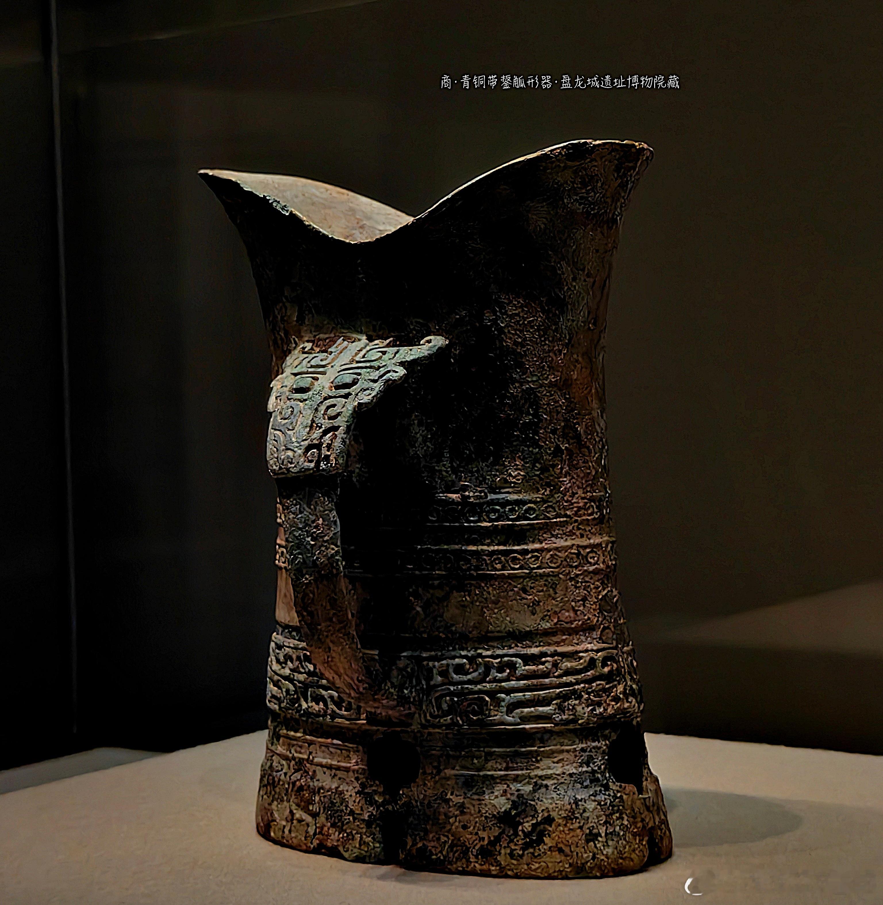 湖北武汉盘龙城遗址杨家湾17号墓出土。觚的口部呈喇叭状外侈,形如绽放的花朵,既增加了器物的美观性,又便于倾倒和注酒 ,是商代青铜酒器中常见的口部造型特征。器身一侧带有鋬,也就是把手。鋬上装饰有兽面纹,兽面双目圆睁,线条流畅且富有张力,这种纹饰在商代青铜器中较为常见,不仅具有装饰作用,还体现了当时的宗教信仰和审美观念。同时,鋬也方便使用者握持。