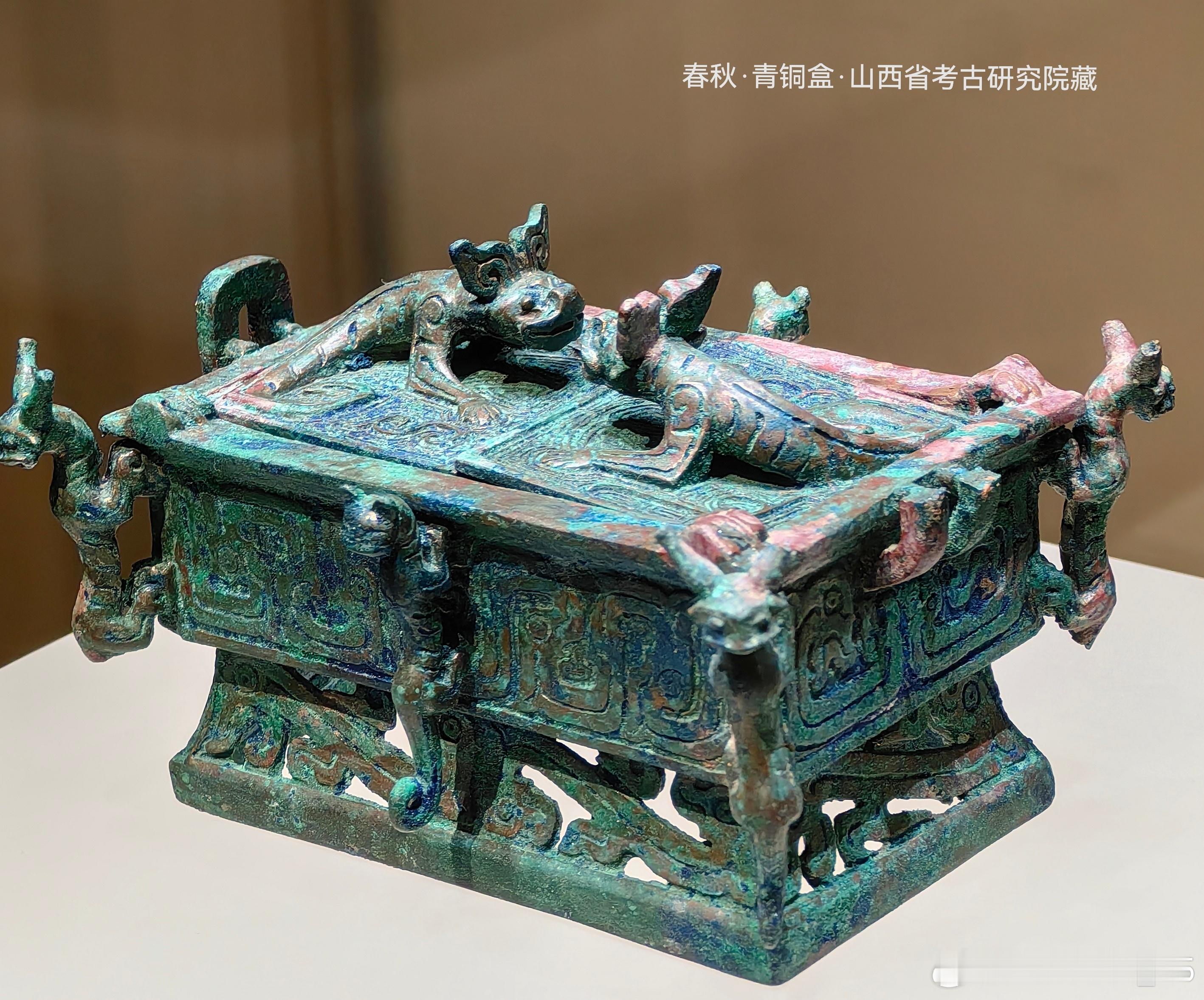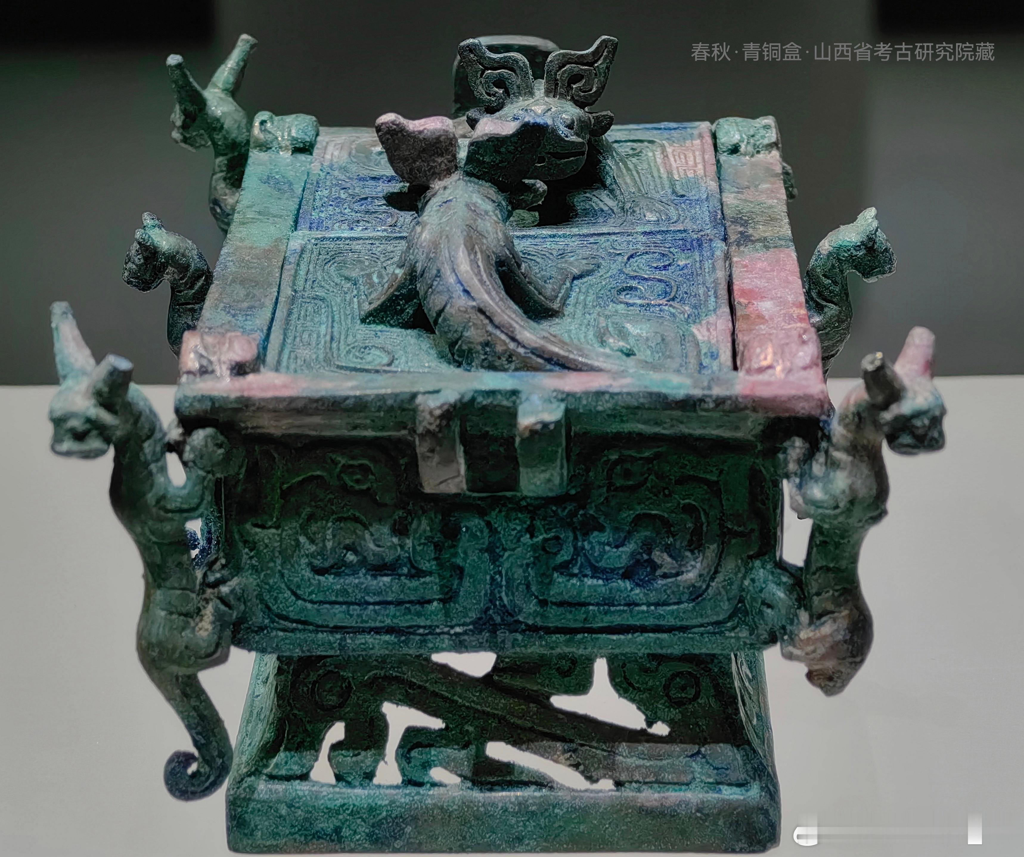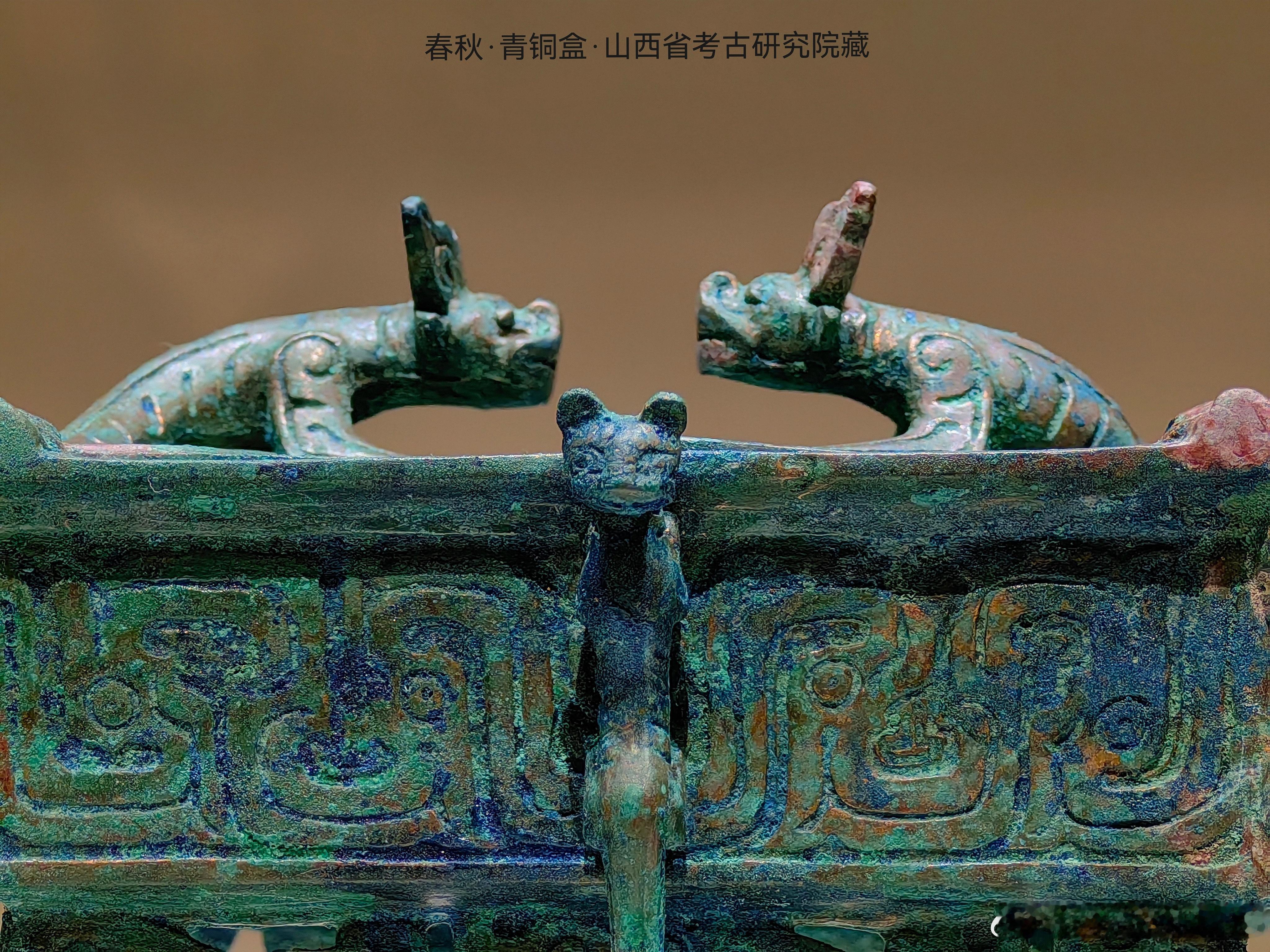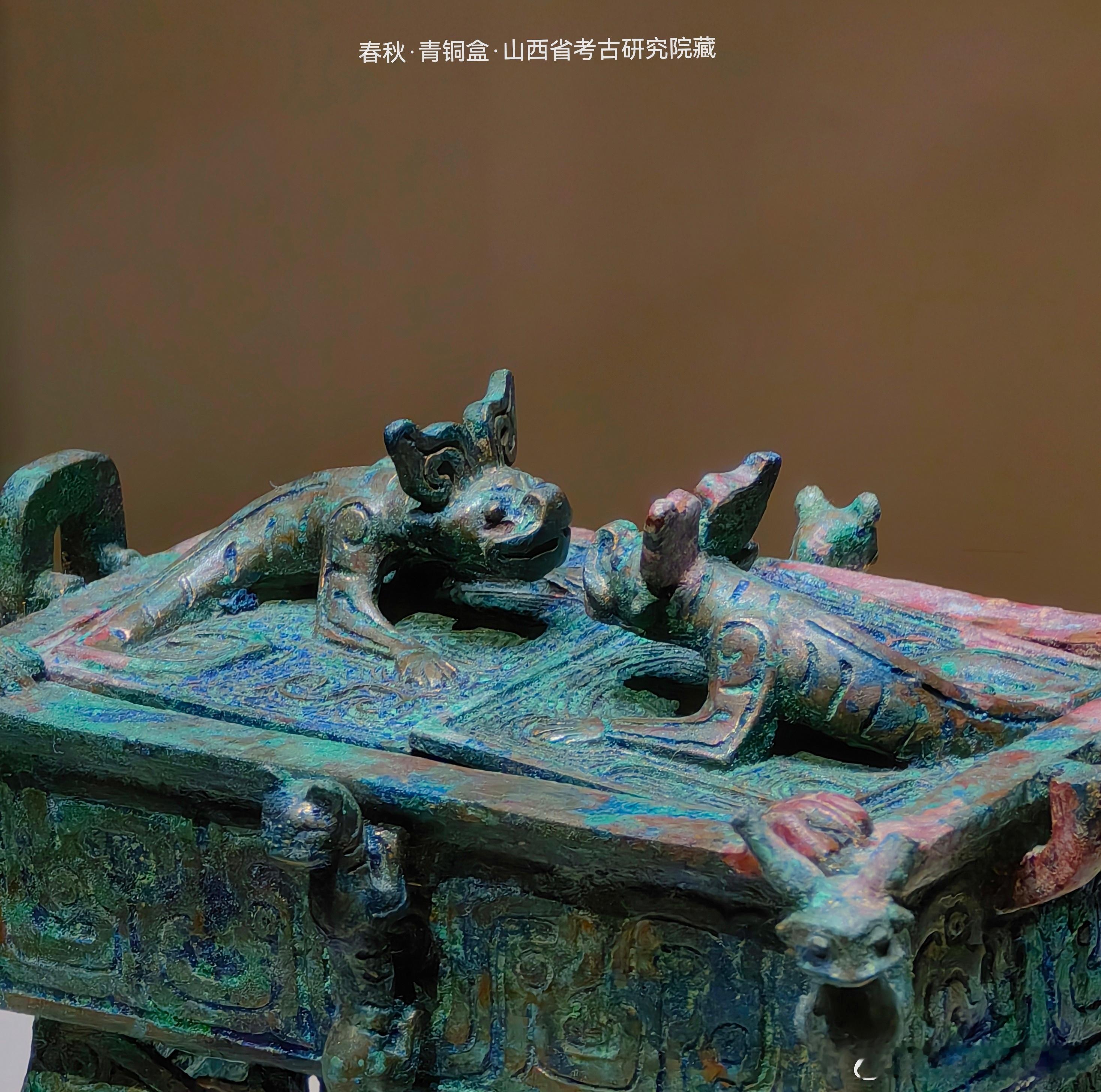 春秋时期,青铜器在工艺和艺术表现上有了新的发展。高浮雕的动物造型,精美的纹饰,是研究春秋时期青铜器铸造技术、艺术风格以及社会文化的重要实物资料。检测表明,铜盒内的残留物是由油脂、植物精油、朱砂及方解石、霰石为主要成份的化妆品,是先秦时期化妆品应用的重要物证。