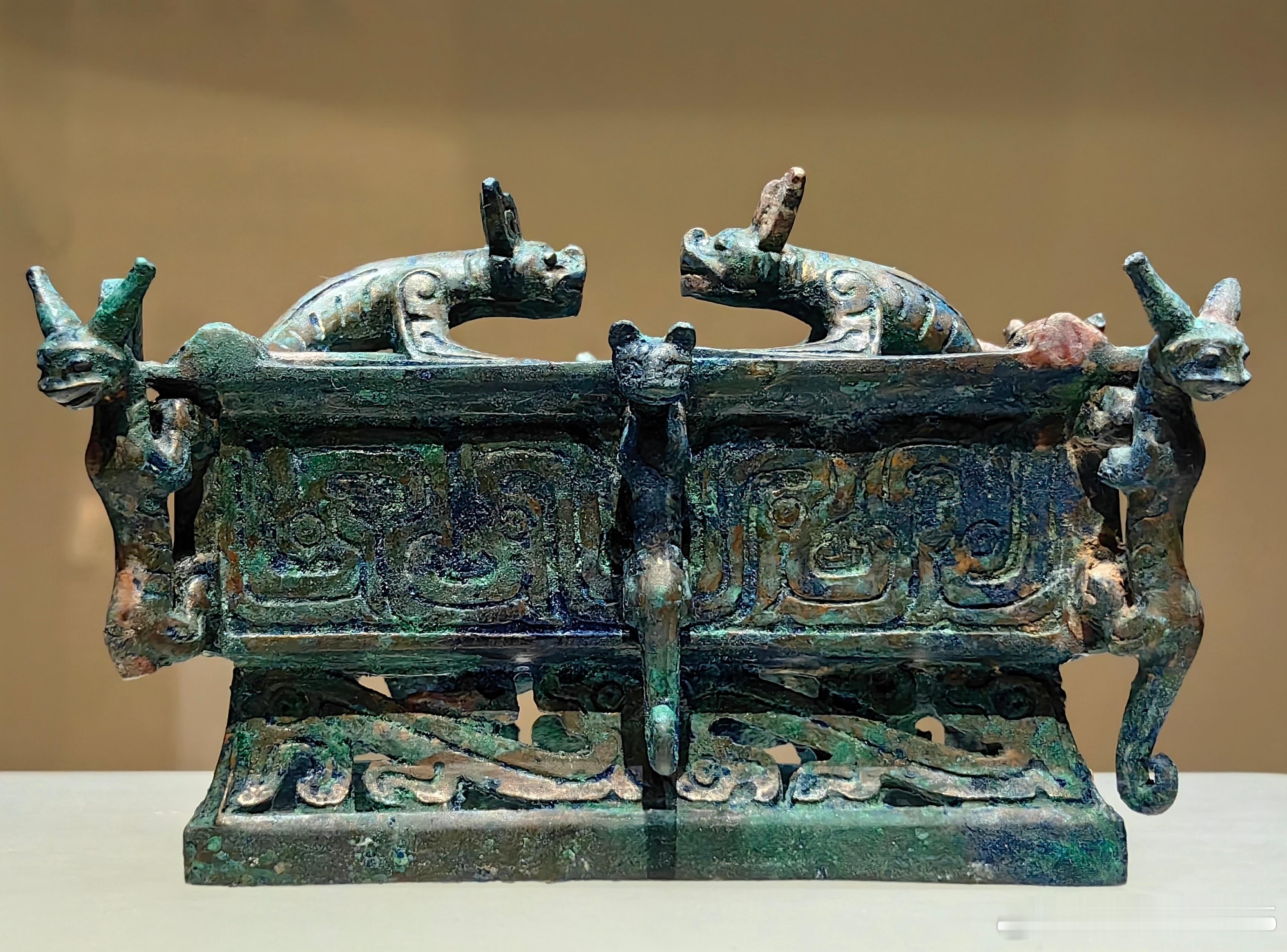 2020年山西垣曲北白鹅墓地出土。长方体青铜盒造型设计独特,盖顶设置立体的兽形装饰作钮,盒身四周对称装饰同样立体兽形,这些动物造型栩栩如生, 给人以灵动之感。底座采用镂空设计,与盒身、盒盖相互映衬,增加了器物的层次感和立体感,使其在视觉上更加丰富、饱满。盒身纹饰精美,无论是浮雕还是阴刻,都展现了高超的雕刻技艺,同时也展现出春秋时期人们对于动物造型的喜爱与艺术表现力。