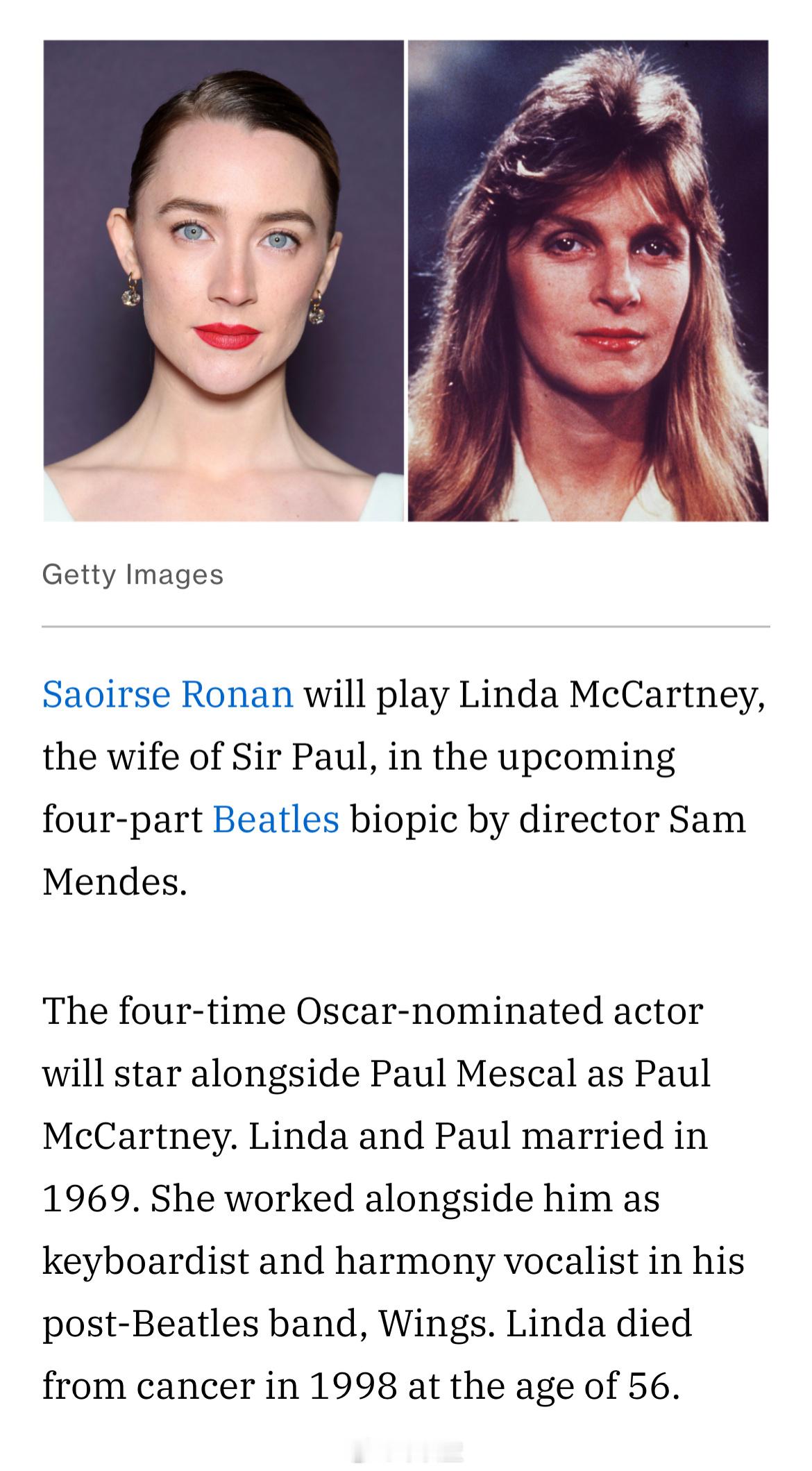 西尔莎·罗南将在披头士传记电影中出演著名乐手Paul爵士的妻子Linda.