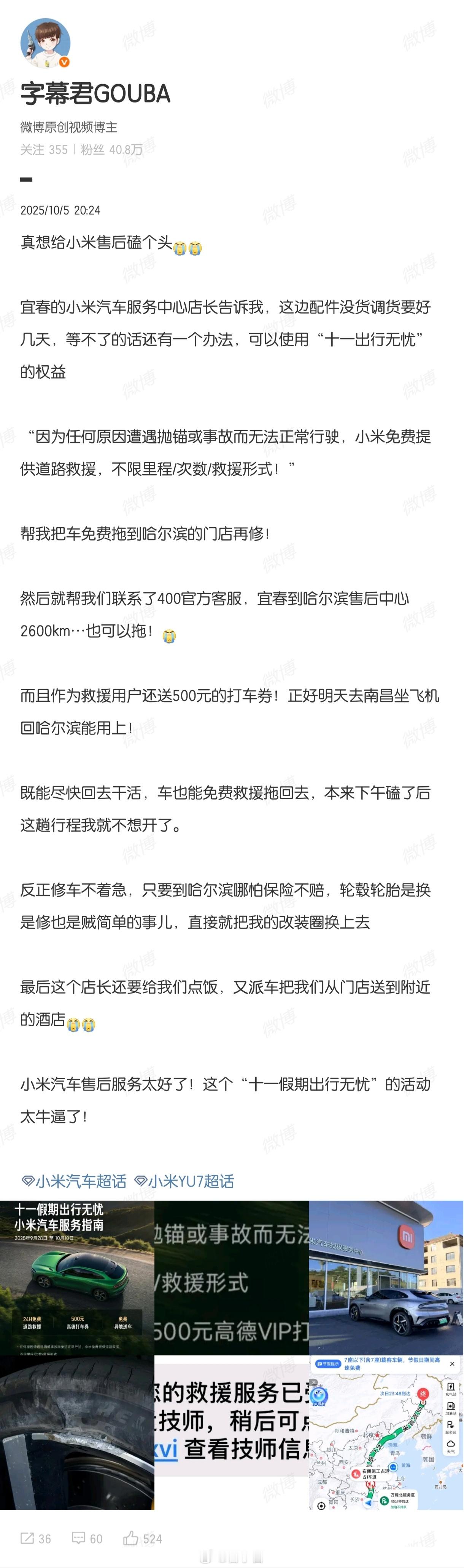 从他的微博来看,本以为要自己承担高额托运费用,没想到联系小米售后,直接享受到了免费异地拖车服务 —— 从宜春到哈尔滨足足 2600 公里,要知道这种距离的板车托运市场价近万元,而且全程 24 小时响应,客服跟进进度特别及时。更贴心的是,售后还主动提供了 500 元打车券,解决了他从当地去机场的交通问题,期间服务中心工作人员还帮忙安排餐饮和住宿,整个流程下来没有任何额外收费,也没有门槛限制,只要是小米车主就能用。