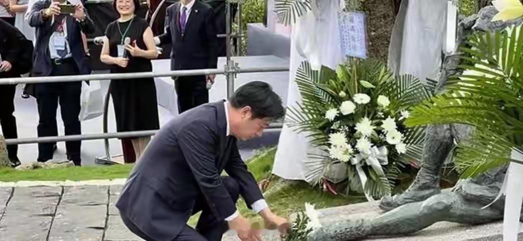 他长期极力推动“去中”政策,篡改历史教育,淡化侵华事实,他甚至多次参拜侵华工程师八田与一,更是给一个令人憎恨的日本人下跪献花(图九)。