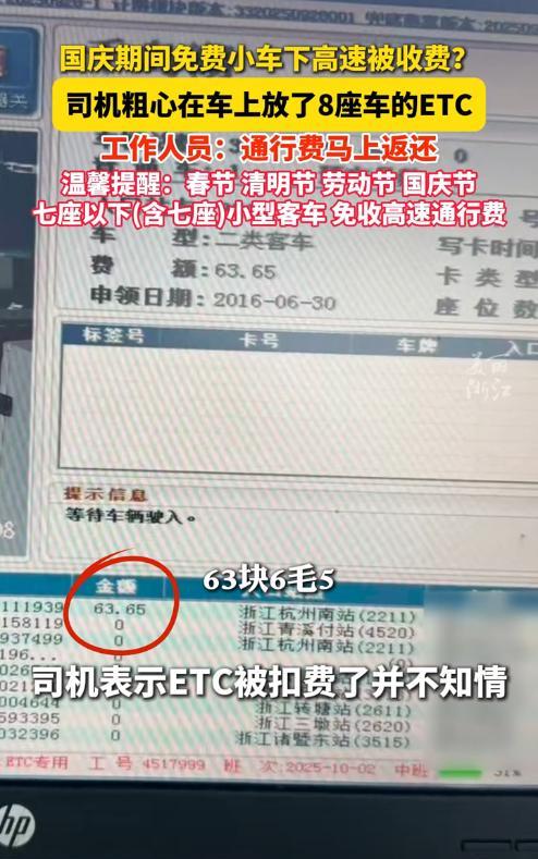 杭州,国庆期间男子开着小轿车下高速,走ETC车道时,系统“嘀”一下就扣了63块,