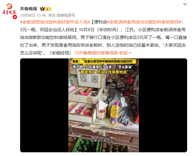 老板误把油当饮料卖好奇咋没人找常州这老板也是绝了!把油当饮料卖,还奇怪没人找来。