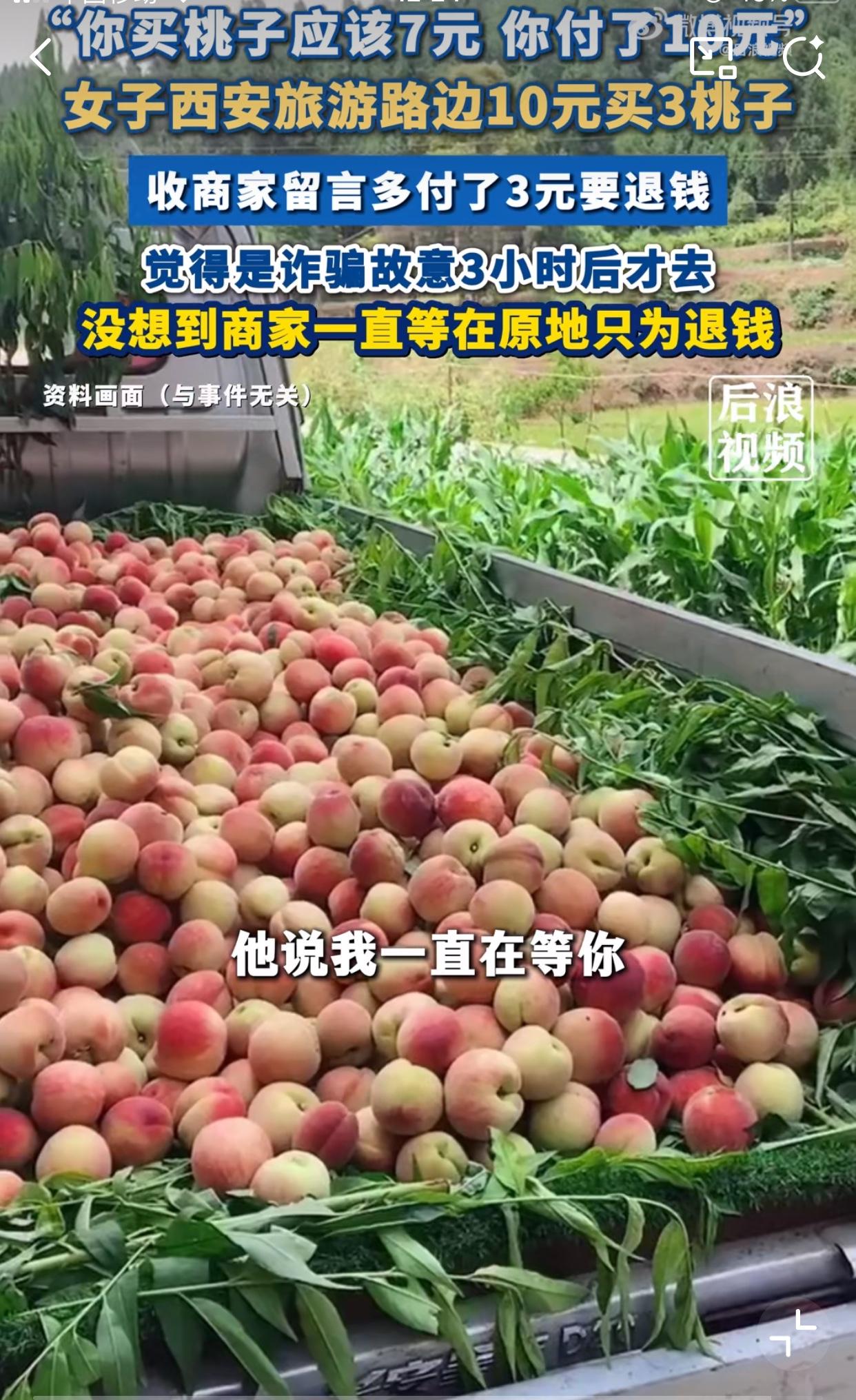 近日一游客在陕西西安旅游,看到路边有位老大哥在卖桃子,游客看着桃子蛮新鲜的,于是就下车来购买,老大哥说桃子3元/斤,于是游客就买了3个桃子,结账时付了10元!游客顿时觉得自己被宰了,但也不想跟他理论了,拿着桃子就走了! 可后面没过多久,游客收到商家的支付留言,说他少付了3元,游客看到后气炸了,我还没跟你理论你宰我,居然还说我少付,于是联系了商家准备跟他理论一番,可等联系上后,商家说,你多付了3元,因为平台留言只能写少付,我在原地等你,我退你三元! 游客觉得是诈骗,直接就挂了电话,等游客游玩了3个小时后,半信半疑的又回到了卖桃子的地方,她看到了卖桃子的老大哥还在原地,本想装作没看见,直接走了,但老大哥看见了她,直接把她叫住,之前你买桃子多付了3元,我一直在等你,多收的钱必须退还给你! 而这一切误会,都因是方言没有听清,导致误付,游客说她第一次遇到商家主动退款,老大哥此举颠覆了她过往对旅游消费的认知,为陕西人点赞!