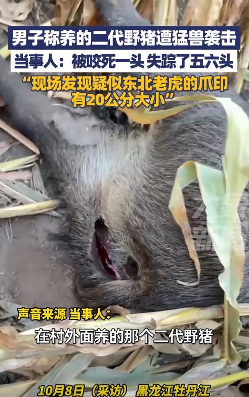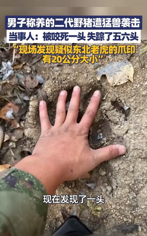 “太吓人了!”黑龙江牡丹江,一男子在村外养了一群“二代野猪”,这天他去查看时,发现少了六、七头猪,最终在玉米地发现了一只被咬穿屁股的野猪,周围有拖拽痕迹,还发现了直径20厘米长的脚印,因此怀疑是东北虎干的!网友:老虎也掏肛吗? 东北虎是现今体型最大的一种老虎,分布在我国东北地区,体重可达四、五百斤,战斗力异常凶悍,捕猎野猪是手拿把掐的事,如今,天气开始变冷,它们为了寻找食物可能会来到村庄附近。 据媒体10月8日的报道,当时男子去看看养的猪怎么样了,结果发现少了好几头猪,他就在周围寻找,最终在玉米地里发现了一头死猪。 男子仔细打量了一番死猪,发现肚子里面已经空了,而且周围还找到了巨大的爪印,以及一道明显的拖拽痕迹。 由于今年春天时男子就发现过老虎,因此推断是老虎袭击了自己的猪,而除了这头死猪外,还有五六头猪不见踪影,不知道是被老虎吃了还是躲到什么地方去了。 但是网友发出了质疑,没有见过老虎掏肛的啊,会不会是熊或者猞猁干的呢?它们的战斗力也不容小觑。 随着天气逐渐转凉,山上的食物变得越来越少,很多猛兽会来到村庄附近觅食,有时甚至还会袭击家畜,因此村民们需要多加小心。 信息来源:《10月8日(采访)黑龙江牡丹江,男子称养的野猪遭猛兽袭击,当事人:被咬死一头失踪了五六头,现场发现疑似东北老虎的爪印有20公分大小》大象新闻