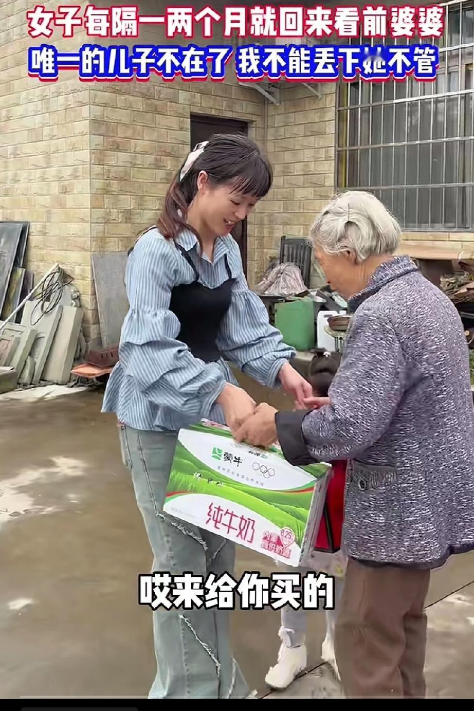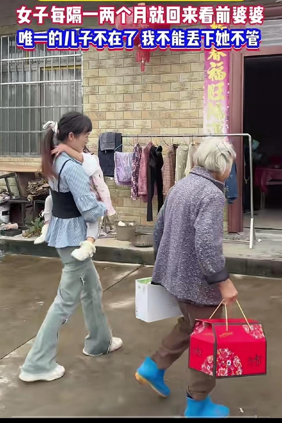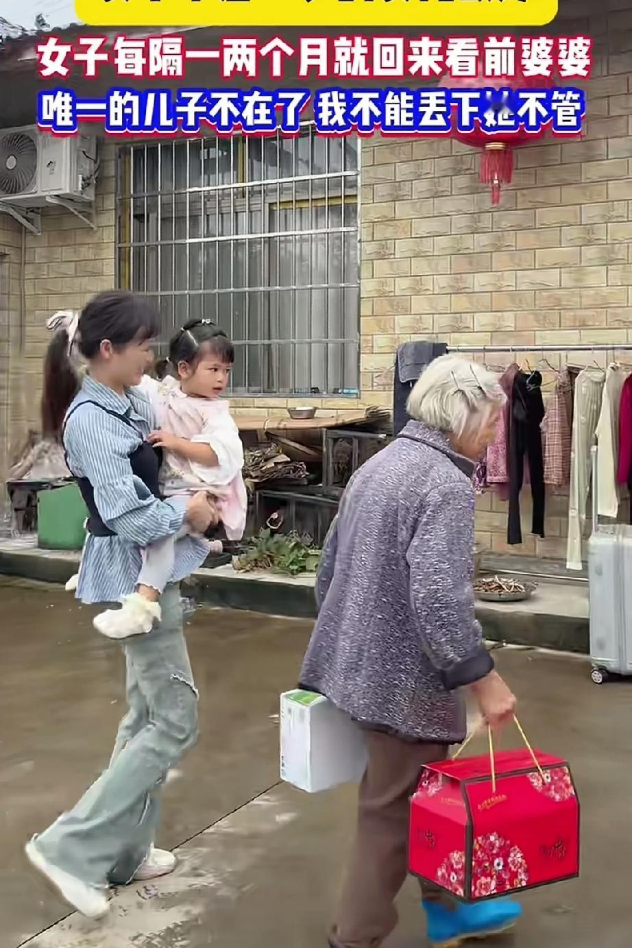 人美心善! 女子结婚没多久丈夫意外离世,女子带着一岁女儿改嫁,心里始终牵挂着前婆婆,女子每隔一两个月就买些礼物回来看望前婆婆。 二人虽然是前婆媳关系,但彼此心里走的很近,女子依然和前婆婆叫妈,女子提着礼物抱着孩子进门就喊妈,好象闺女见到亲娘一样亲切,前婆婆笑呵呵的迎接女子,赶紧把女子领进内屋招待,女子承诺:前婆婆唯一的儿子不在了,我不能丢下她不管! 只可惜前夫走的太早,不然婆媳关系亲如母女,祝福这对特殊的婆媳关系相信以后日子的会越来越好!
