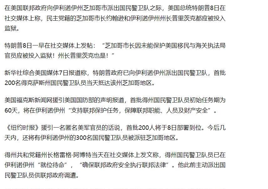 “战区”要点燃?在美国联邦政府向伊利诺伊州芝加哥市派出国民警卫队之际,美国总统特朗普8日在社交媒体上称,民主党籍的芝加哥市长约翰逊和伊利诺伊州州长普里茨克都应被投入监狱。 几个月前,特朗普政府启动了全国范围的移民清查,重点锁定那些被视为“公共安全威胁”的无证移民。 不同于以往的边境拦截,这次行动深入内陆城市,芝加哥作为全美第三大都市,自然首当其冲。 移民与海关执法局的突击队像精密机器般运转,他们在社区、学校周边和工厂区布下天罗地网,逮捕了上千名嫌疑人。 这些人中,不仅有涉嫌犯罪的帮派成员,还有普通劳工和家庭主妇,他们的罪名往往只是签证过期或庇护申请拖延。 芝加哥市长布兰登·约翰逊,作为一位进步派民主党人,早就在市政厅竖起“庇护城市”的旗帜。 他签署行政命令,禁止联邦执法人员在学校、医院和公园等公共场所行动,这直接切断了ICE的行动链条。 伊利诺伊州长JB·普里茨克则更进一步,他公开宣布州政府将动用一切法律手段阻挡联邦干预,甚至提起诉讼,指责白宫的部署违反州权原则。 结果联邦部队已经在城外集结,数百名国民警卫队士兵待命,空气中弥漫着对峙的火药味,约翰逊和普里茨克的举动,让芝加哥成为抵抗的象征,但也暴露了地方资源的捉襟见肘。 特朗普的回应如雷霆般落下,他在社交平台上直言不讳:芝加哥当局未能保护执行任务的ICE人员,这不仅是失职,更是妨碍联邦执法。 特朗普点名市长和州长,宣称他们该为街头混乱负责,直接进监狱伺候。 特朗普的监狱叫嚣,犀利却短视,它像一把双刃剑,斩断了地方自治的根基,却也伤及联邦信誉。 美国梦本该是包容的灯塔,现在却在铁丝网后黯淡,地方领袖的抵抗,勇敢却无力,他们守护的不仅是移民,更是民主的底线——如果联邦能随意监禁异见者,那宪法还有何尊严? 这不是保护国家,而是权力游戏的升级版,输家永远是那些无名小卒,移民不是抽象数字,他们是社区的脉络,驱逐他们等于自断臂膀。 特朗普的政策或将加速劳动力外流,建筑业已现短缺,餐饮价格飙升,这会反噬中产阶级的钱包。 民主党若一味对抗,也难逃责难:他们承诺庇护,却未拿出可持续方案,导致城市资源崩盘。 真正出路,或许在于国会改革——重建庇护路径,平衡执法与人权,而不是让总统一人说了算。 你怎么看这场权力拉锯?是联邦铁律救国,还是地方人文更可贵? 信息来源:上观 特朗普又发飙:芝加哥市长和伊利诺伊州州长都该入狱