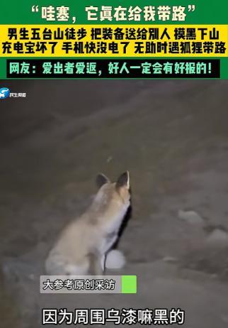 男子五台山徒步旅游,下山的时候四周一片漆黑,手机也快没电了,正当他担心找不到下山路的时候,突然他的面前出现一只狐狸给他带路,狐狸在前面走,他就在后面跟着,狐狸怕男子跟不上就两步一回头等着,男子跟上后它又继续走,最终男子在狐狸的引路下成功在手机没电前安全走下山! 一只狐狸在五台山的秋夜里,领着手机只剩21%电量的男人下山。 这事在网上吵了好几天有人说“万物有灵”,有人说“纯属巧合”,连专家都专门出来解释。 可不管怎么说,陈先生确实靠着这只狐狸,从黑漆漆的岔路口走到了有灯光的终点。 事情发生在10月2日清晨,他从鸿门岩出发,计划走38公里环线,当时背包里装着蓝色急救包、绿色帐篷和灰色睡袋,装备齐全。 没走多久,就遇到两个大二学生,俩人临时来徒步,急救包里连止血带、消毒凝胶都没有,蹲在路边急得团团转。 陈先生看他们年纪小没经验,直接把急救包递了过去,还蹲下来教他们怎么处理外伤,反复嘱咐“迷路别乱走”。 到了10月3日上午,又碰到个第一次来五台山的老乡,老乡没做攻略,没订住宿,连帐篷都没带,手里就攥着一瓶水。 陈先生想着自己走得快,傍晚前肯定能下山,便把帐篷和睡袋都留给了老乡,只带着手机、保温杯和压缩饼干继续赶路。 麻烦是从3日下午开始的。 原本还算晴朗的天,突然被乌云盖得严严实实,不到四十分钟,山里就黑得像半夜。 陈先生凭着记忆找路,可夜里的岔路长得一模一样,根本分不清方向。 他掏手机想打开手电筒,这才发现早上摔在石头上的充电宝早就坏了,手机电量只剩21%。 更糟的是,早上在观景台遇到一对抱孩子的夫妻,人家迷路了,手机也快没电,孩子冻得缩在妈妈怀里,他没多想就把银色手电筒给了他们,现在连个备用的光源都没有。 站在分岔路口,陈先生越想越慌。 山里静得只能听见风声,还有自己“砰砰”的心跳声,手机地图加载不出来,定位不准,电量还一格格往下掉。 没帐篷没睡袋,山里晚上温度低,真要是手机关机,连求救电话都打不出去,说不定还会失温。 就在他来回踱步,心里发毛的时候,脚边的草丛突然有了动静。 他吓了一跳,赶紧把手机屏幕对着草丛,只见一只浅棕色的半大狐狸钻了出来。 这只狐狸一点都不怕人,就站在离他一米远的地方,眼睛在昏暗的光线下亮闪闪的,盯着他看。 陈先生没敢动,就这么对视了五六秒,狐狸突然转过身,朝着右边的小路走了两步,然后停下,又回头看了他一眼——像是在问“你跟不跟”。 陈先生没别的办法,只能举着手机,跟着狐狸往小路走。 接下来的二十五分钟,陈先生后来跟人提起时,总说“像做梦一样”。 狐狸走得不快,每走十二三步就会停下,转过头确认他跟上了,才继续往前走。 他走得慢了,狐狸就多等一会儿;他加快脚步,狐狸也稍微提速,始终保持着不远不近的距离。 手机的微光刚好能照到狐狸的尾巴,那尾巴一摆一摆的,成了黑夜里唯一的“路标”。 直到远处出现一点微弱的亮光,陈先生仔细一看,才发现是红门岩终点的灯光,心里一下子松了口气。 可等他快步走到有光的地方,再回头想找那只狐狸时,狐狸早就钻进旁边的树林里,没了踪影,仿佛从来没出现过。 其实这种事也不是第一次发生。 之前黑龙江有一家四口去爬长白山,走到半路上迷了路,天快黑的时候,一只黑色的大猫突然出现,也是走几步就回头,领着他们走了一个多小时,最后顺利下了山。 而且现在五台山的生态环境确实越来越好,有人还在山里拍到过国家二级保护动物中华斑羚,在崖壁上跳来跳去的,动物不怕人,说明它们没受到过人类的伤害,这也是人和自然和谐相处的样子。 不过还是要提醒一句,陈先生这次能顺利下山,运气占了很大一部分。 要是其他人在山里遇到野生动物,可不能像他这样直接跟着走。 最好的做法是保持距离,别主动靠近,也别大声驱赶,野生动物的脾气没人能完全摸透,万一觉得受了威胁,发起攻击就麻烦了。 对陈先生来说,这场秋夜的相遇,是善意和巧合凑在一起的意外,当成一段特别的回忆记着,就已经很好了。 那么到最后,你们是怎么看的呢? 如果各位看官老爷们已经选择阅读了此文,麻烦您点一下关注,既方便您进行讨论和分享,又能给带来不一样的参与感,感谢各位看官老爷们的支持