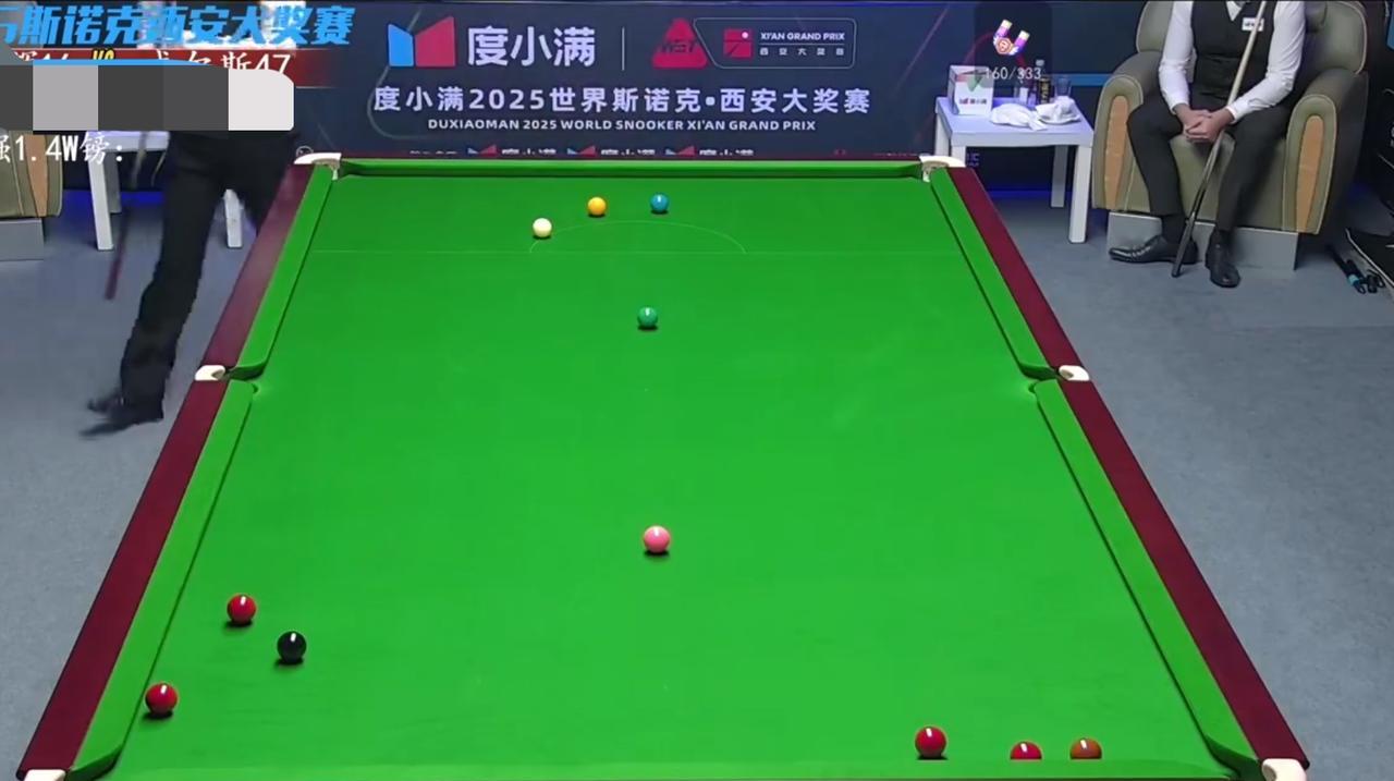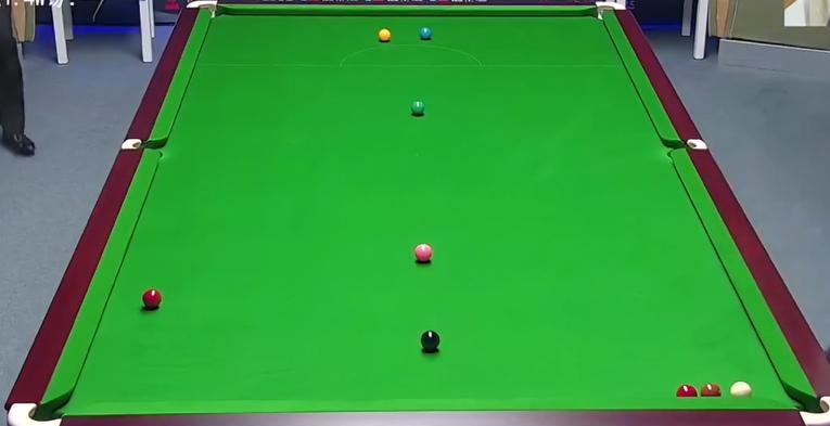 真是活久见,斯佳辉和丹尼-威尔斯的比赛竟然把球型打成了这样。威尔斯怕憋不住尿,提出了重摆的请求,斯佳辉因为领先着15分就没有同意。几轮较量过后,斯佳辉不小心把黑球打进了袋。威尔斯获得上手机会,单杆45分取得领先。进攻权几度易手之后,比赛再次进入胶着局面。 最后威尔斯成功找到斯佳辉的痛点,做了一杆几乎是无解的斯诺克,率先拿到赛点。注意图三白球的旁边是咖啡球,如果不是左侧裤边还有一颗红球,那就无解斯诺克了。