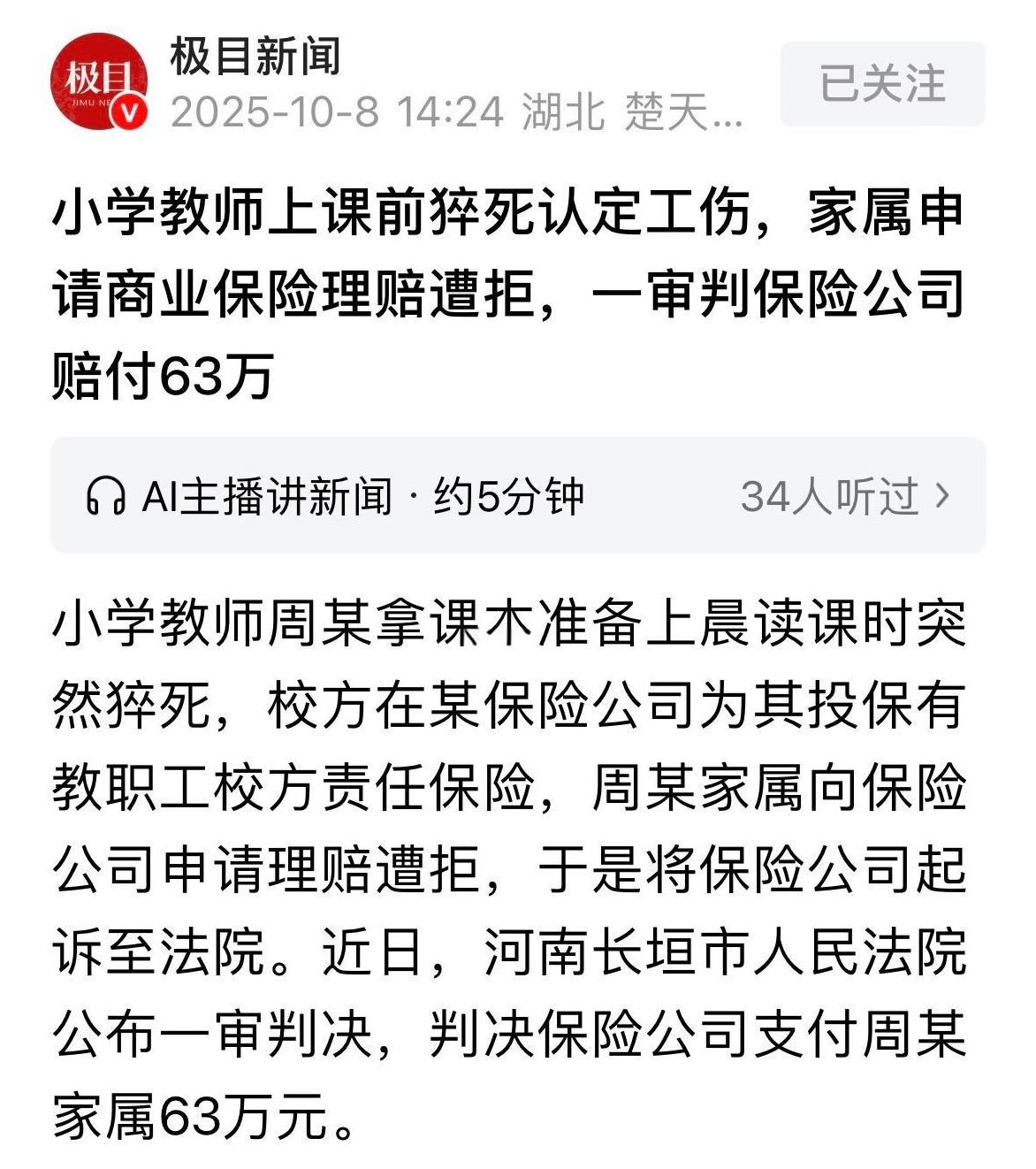 河南长垣,女老师带完早操,来到办公室拿课本准备带晨读,谁知,她突然晕倒在地,等救护车赶到,已经没了生命体征,经抢救还是无力回天,学校给她投了教职工校方责任险,人走后,家属就找保险理赔,按约定,在工作期间发生意外导致人身伤害的,保险公司最高可以赔付63万,然而,保险公司却以死者已经获得工伤保险赔偿为由,拒绝赔偿,家属直接告上法庭,法院判了! 2025年3月26号早上,小学五年级班主任周老师像往常一样带完早操,跨进办公室准备拿课本上晨读课。 然而,她突然毫无征兆地晕倒在地,同事们见状连忙打了120求救,过了4分钟,接到消息的村医先行赶到,开始了急救。 到了7点08分,救护车抵达时,医生检查发现,周老师已经没有生命体征了,经过40分钟的全力抢救,仍然无力回天。 死亡证明显示,周老师的死因是心源性心脏病突发导致的恶性心律失常。 家属悲痛着办完后事,就开始谈后续的保险理赔问题,然而,并没有他们想象中顺利。 学校之前给周老师投保了教职工校方责任险,保险期从2024年9月1号到2025年8月31号。 条款上约定,教职员工在工作期间因意外或职业病导致人身伤害,校方需承担赔偿责任时,保险公司最高赔付身故金60万元及法律费用3万元。 但当家属向保险公司申请理赔时,对方却以“已获工伤保险赔偿”为由拒绝赔付,这让家属们无法接受。 好在到了2025年5月20号,转机出现了。人社局依据《工伤保险条例》,认定周老师猝死属于视同工伤。 3个月后,社保中心通知家属,预计9月可领取工伤保险待遇。 然而保险公司仍坚持“工伤赔付后商业保险不再赔偿”的立场,双方僵持不下,家属最终将保险公司告上法庭。 有人说,保险公司收保费时,都十分积极,一到理赔的时候,就翻出条例,找出各种理由不能理赔,即然双重保险不能理赔,那上保险时,你干嘛收双重保费呢?难道理赔时都要到法院,打漫长的官司才能解决。 那么,从法律角度,怎么看待这件事? 《工伤保险条例》第15条第1项规定:职工在工作时间和工作岗位,突发疾病死亡或者在48小时之内经抢救无效死亡的,视同工伤。 周老师带完早操后,在办公室准备晨读课本时突发晕倒,经抢救无效死亡,符合“工作时间、工作岗位、突发疾病死亡”的三要素。 人社局据此作出《工伤认定书》,明确她的死亡视同工伤。这个认定直接触发了校方责任险的理赔条件,根据保险条款第4条,教职员工因“工作期间从事被保险人工作遭受意外事故”导致身故,保险公司需承担赔偿责任。 法院审理后认为,周老师是在工作时间内因执行学校事务突发疾病身故,完全符合校方责任险的理赔条件。 《保险法》60条规定:保险事故发生后,保险人未赔偿保险金之前,被保险人放弃对第三者请求赔偿的权利的,保险人不承担赔偿保险金的责任;保险人向被保险人赔偿保险金后,被保险人未经保险人同意放弃对第三者请求赔偿的权利的,该行为无效。 保险公司以“工伤保险已赔付”为由主张免除商业保险责任,但法院明确指出,工伤保险属于法定强制社会保险,而校方责任险属于商业自愿投保,两者性质不同且无合同约定排除双重赔偿。 根据规定,商业保险的赔付责任独立于其他赔偿途径,除非保险合同明确约定“社会保险优先或替代商保赔付”。本案保险条款未设置此类免责条款,因此保险公司不能以工伤保险赔付为由拒赔。 法官特别指出,工伤保险是法定强制保险,而校方责任险属于商业自愿投保,两者性质不同、功能互补,除非合同明确排除,否则可以同时获赔。 9月2号,法院作出判决:保险公司必须按合同支付60万元身故赔偿金和3万元法律费用,总计63万元。 判决书中强调,商业保险合同具有契约自由属性,在无特别免责条款的情况下,保险公司不能以社会保险赔付为由拒绝履行合同义务。 对此,你怎么看? 关注@运良说法 学法律知识不迷路 #头号创作者激励计划#