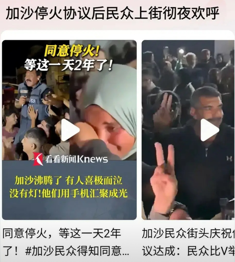 这才是百姓真正所需要的! 以色列与哈马斯签署第一阶段停火协议后,看加沙民众的反应! 有人喜极而泣! 有人开心比V! 百姓脸上洋溢着笑容! 没有灯,不影响民众上街彻夜欢呼! 他们把手机汇聚成光,照亮黑暗! 百姓真正需要的是和平! 希望后期谈判一切顺利! 让加沙百姓安宁地生活!