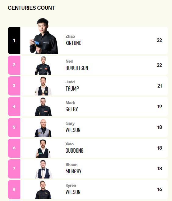 斯诺克本赛季单杆破百数最新世界排名,尼尔-罗伯逊超越贾德-特鲁姆普升至第二! 2025斯诺克西安大奖赛1/16决赛,丁俊晖、贺国强等八位球员晋级16强。 墨尔本机器尼尔-罗伯逊在与贺国强的比赛中打出两杆破百,本赛季破百数来到22杆,超越贾德-特鲁姆普的21杆。 罗伯逊是第一个在单赛季打出单杆破百数超过百杆的球员。 之后贾德-特鲁姆普有两个赛季打出超过百杆的单杆破百。 第一:赵心童22; 第二:N罗伯逊22; 第三:特鲁姆普21。 #2025斯诺克西安大奖赛#