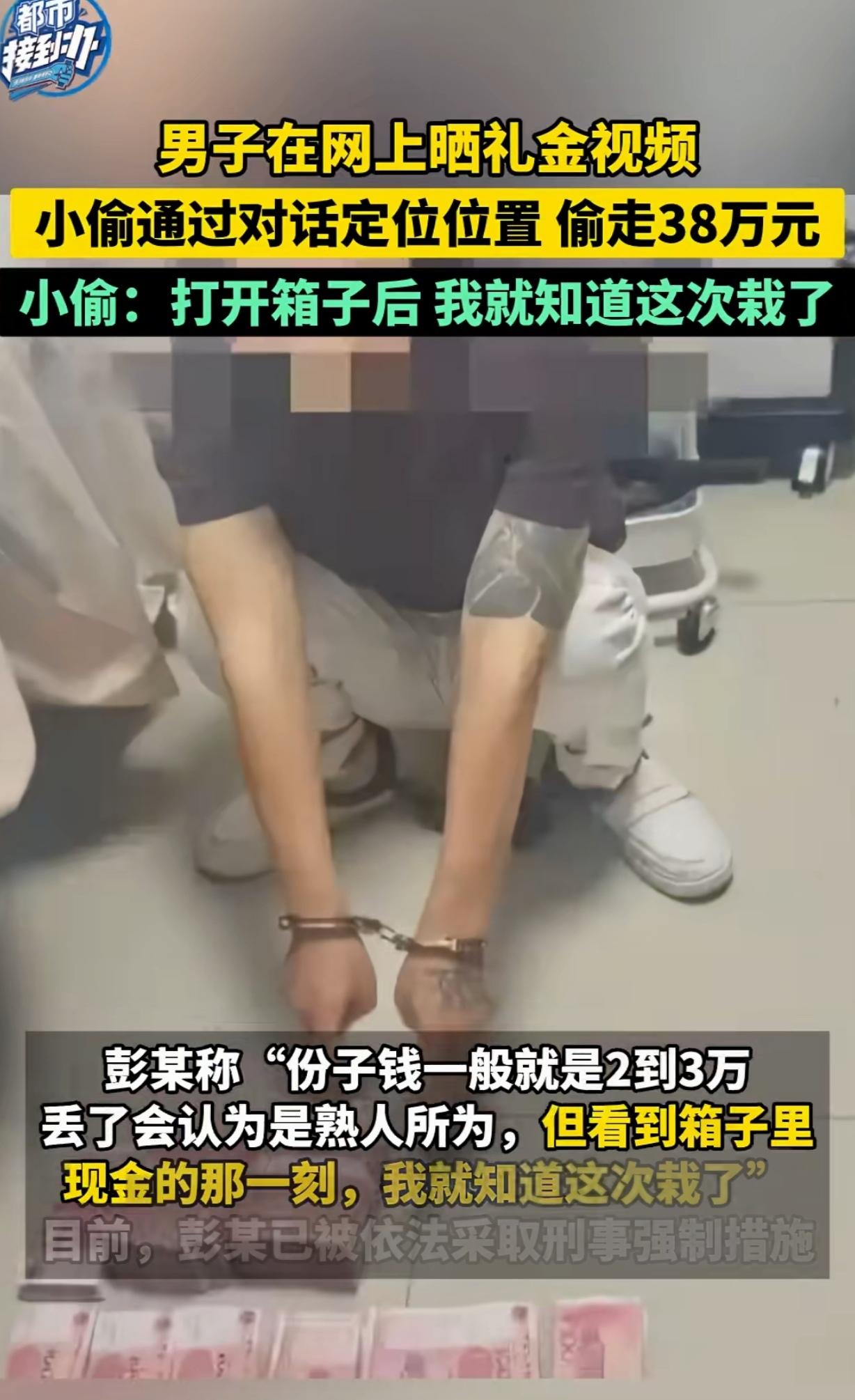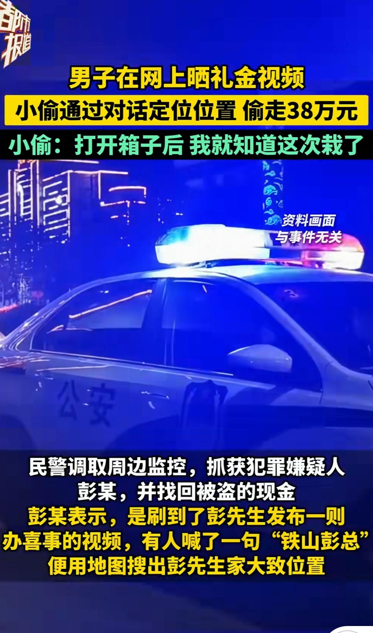 “这就是炫耀的后果!”江西鹰潭,一男子儿子结婚,收了38万礼金,他拍视频显摆,万万没想到,视频被一小偷刷到,小偷通过视频中的一句话,直接找到了男子家,把38万礼金连窝端。网友:还晒吗?活该! 这天,是彭先生儿子结婚的日子,彭家添人进口,当然要大操大办。 而且,彭先生家境殷实不差钱,所以,他决定张灯结彩,在乡里乡亲面前挣足面子。 因为多年积累的人脉,亲戚朋友都来捧场,宾客云集,礼金收到手软,最后一清点,竟然高达38万。 彭先生一高兴没忍住,直接拍视频炫耀,无非是想让人知道自己人缘好,混的开,想风光一把。 可万万没想到,一个小偷彭某闲来无事正好刷到了这个视频,看着花花绿绿的钞票,装满一箱子,立马两眼放光,垂涎三尺。 可小偷怎么锁定彭先生家的位置呢?这个不难,因为视频里有人喊了一声“铁山彭总!”,这成了蛛丝马迹,彭某立马灵机一动,通过地图,搜出彭先生家的具体地址。 在婚礼上趁乱偷礼金,彭某已经得手一次了,有经验的他,这次也轻车熟路。 在彭某看来,主家礼金丢失,肯定会认为是亲戚朋友顺手牵羊,基于家丑不外扬的心理,一般不想把事闹大,怕不好收场,只能自认倒霉不会报警。一般礼金都是两三万元,金额也不大。 所以,偷礼金来钱快,而且,主家忙着迎来送往也好得手,所以,锁定彭先生家地址后,彭某直接就去了。 彭某很快就得手了,可当他打开箱子傻眼了,他万万没想到,礼金竟高达38万,这么多钱,主家不可能不报警,但财帛动人心,彭某既然都偷出来了,也不可能给送回去。 彭某打开箱子那一刻,就知道这次栽了,可他还是执迷不悟,以身试法。 很快,彭先生发现礼金丢了,赶紧报了警,帽子叔叔根据路边的监控,锁定了彭某,并把他抓捕归案。 彭先生说啥都没想到,是自己的视频把小偷招来的,他这是引狼入室。 目前,彭某已经被采取刑事强制措施。 彭先生在儿子婚礼上收38万礼金后,因一时虚荣心作祟拍视频炫耀,却引来了小偷,最终导致礼金被盗,实在是得不偿失。 他本想通过视频展现自己的“风光”,却忽视了可能带来的风险,这种行为不仅缺乏安全意识,更暴露了其对隐私保护的轻视。 财富与幸福本无需通过炫耀来证明,真正的体面源于内心的从容与对他人的尊重。此次事件无疑给彭先生敲响了警钟:行事需谨慎,切莫因一时虚荣而招致祸端,低调行事方能保得平安。 《刑法》第264条规定:盗窃公私财物,数额较大的,或者多次盗窃、入户盗窃、携带凶器盗窃、扒窃的,处三年以下有期徒刑、拘役或者管制,并处或者单处罚金;数额巨大或者有其他严重情节的,处三年以上十年以下有期徒刑,并处罚金;数额特别巨大或者有其他特别严重情节的,处十年以上有期徒刑或者无期徒刑,并处罚金或者没收财产。 彭某盗窃彭先生38万元礼金,根据《最高人民法院、最高人民检察院关于办理盗窃刑事案件适用法律若干问题的解释》第1条,“数额特别巨大”的标准为30万元至50万元以上。 江西地区执行该标准,因此38万元已构成“数额特别巨大”,符合《刑法》第264条中“十年以上有期徒刑或者无期徒刑”的法定刑档次。 彭某此前已有盗窃婚礼礼金的犯罪经历,属于“多次盗窃”,且此次犯罪手段具有预谋性,通过短视频锁定目标并踩点,属于“其他特别严重情节”,可能加重处罚。 《最高人民法院、最高人民检察院关于办理盗窃刑事案件适用法律若干问题的解释》第1条规定:盗窃公私财物价值一千元至三千元以上、三万元至十万元以上、三十万元至五十万元以上的,应当分别认定为刑法第二百六十四条规定的“数额较大”“数额巨大”“数额特别巨大”。 本案涉案金额38万元已达到该标准,彭某的盗窃行为依法应适用最高量刑档次。 彭某利用网络信息精准锁定目标、多次实施盗窃,反映出其主观恶性深、社会危害性大。司法机关在量刑时,将结合其犯罪手段、前科记录及涉案金额,依法从严惩处,以实现罪责刑相适应。 彭先生因炫耀财物暴露隐私信息招致犯罪,凸显了个人信息保护的重要性。大家避免在公开平台展示贵重财物或泄露住址信息,以免成为犯罪分子的“靶子”。 彭某的盗窃行为因金额特别巨大且情节恶劣,将面临十年以上有期徒刑的严惩。 同时,彭先生的遭遇警示公众:网络“晒富”需谨慎,隐私保护不可忽视。 对此,你怎么看? 关注@灋律盐究员 学法辩是非,用法止纷争。