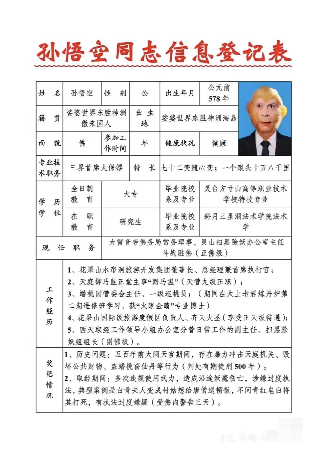 如果用今天的文案给孙悟空填写一张个人履历表,会是什么样子呢? 这位网友太有才了