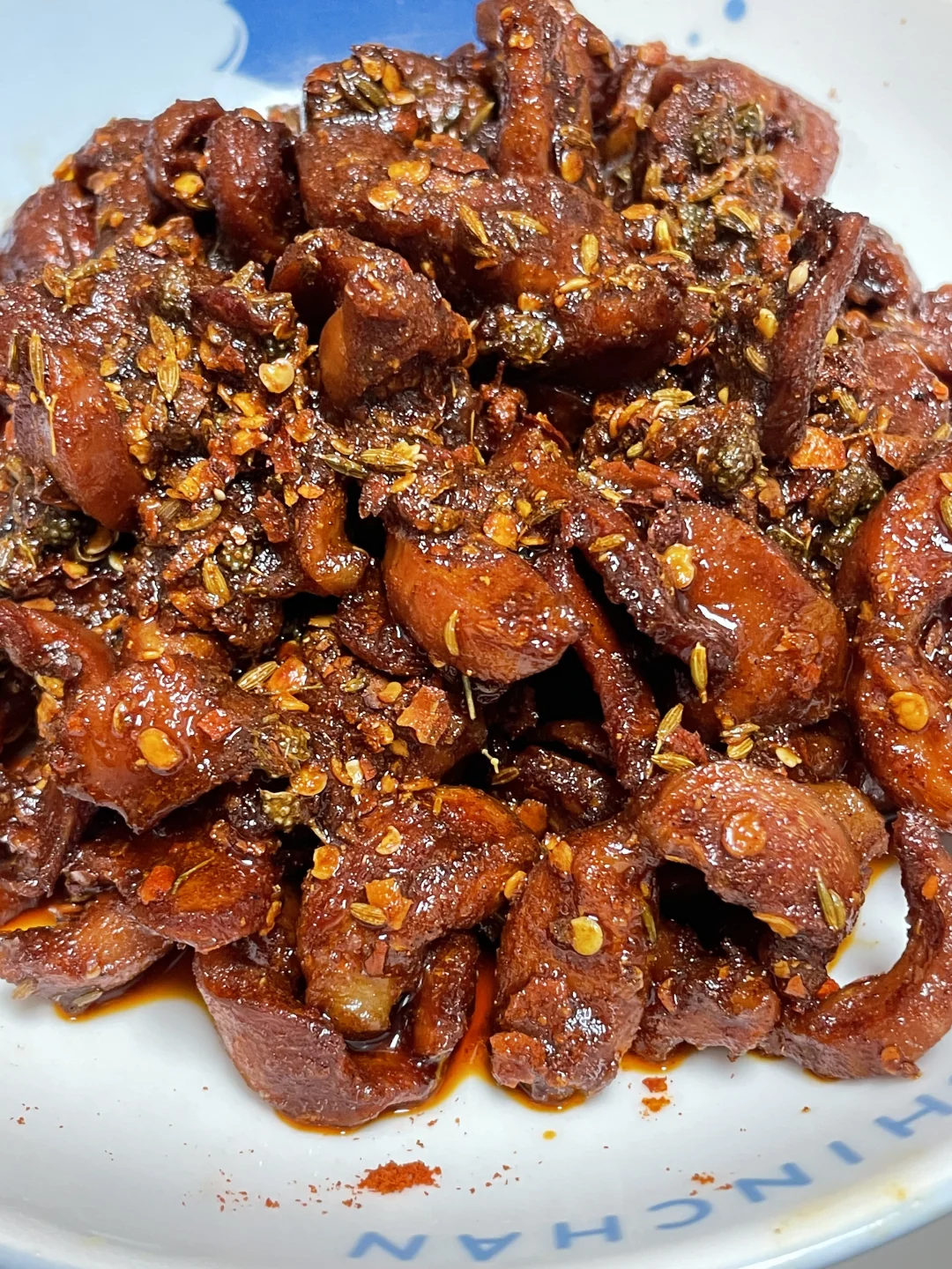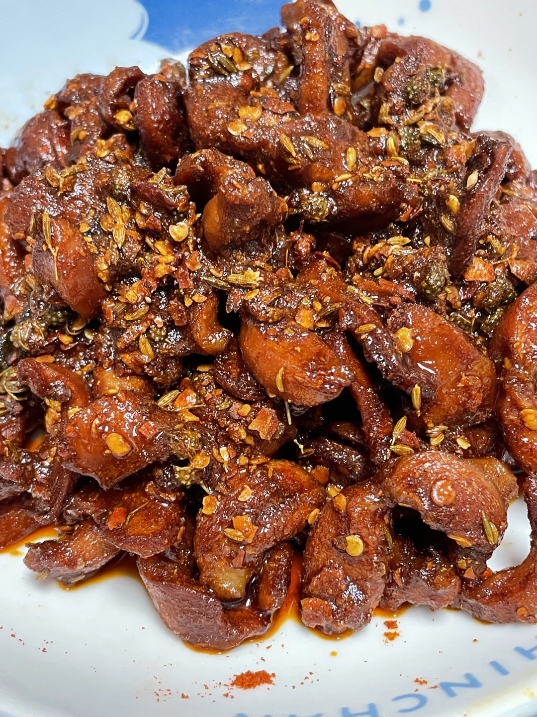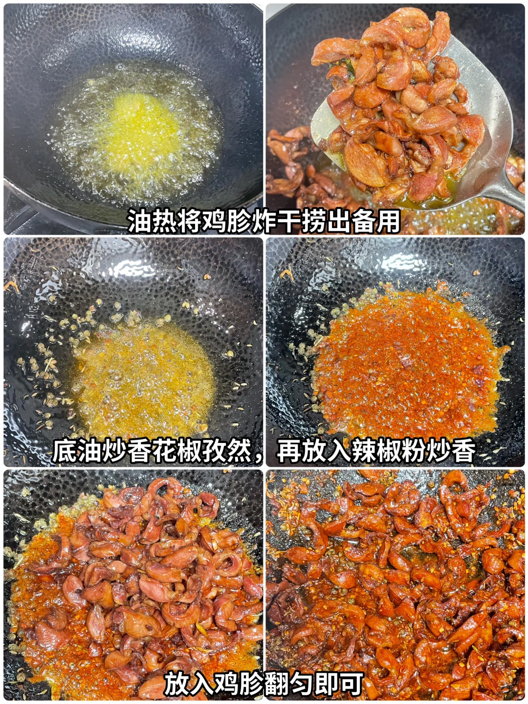 3⃣️起锅烧油,油温7成热时放入鸡胗炸至水分较干时捞出(干点会好吃一些),然后锅里留点底油炒香花椒和孜然,再放入辣椒粉翻匀,加入鸡胗。翻匀即可出锅。