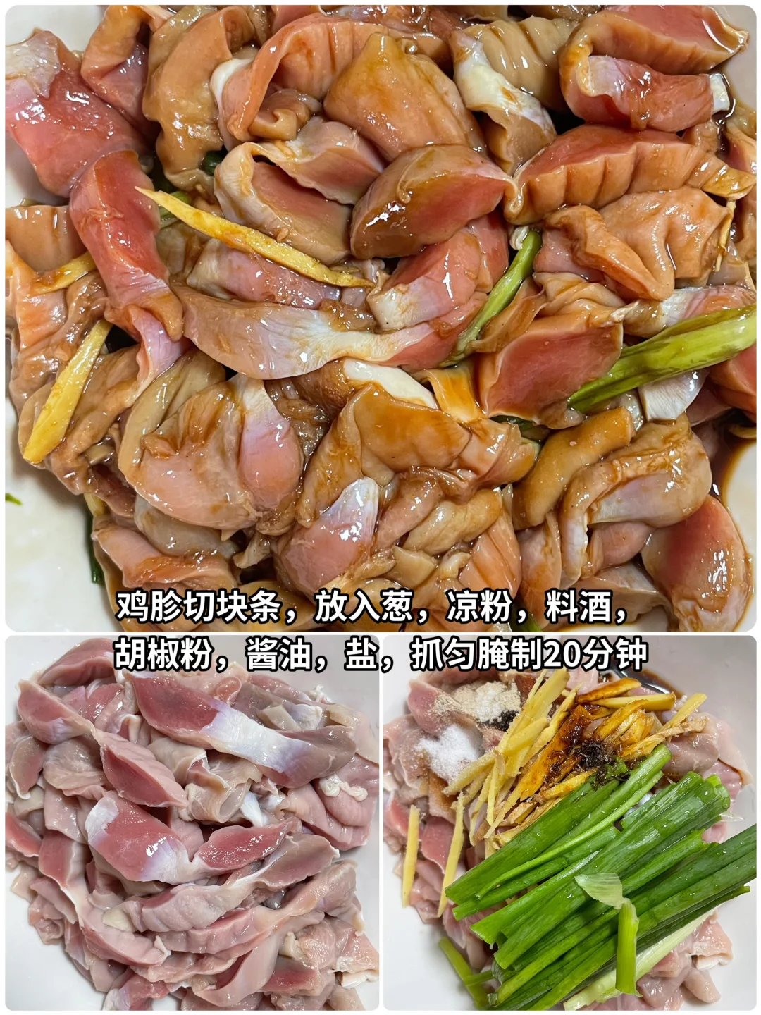 1⃣️将鸡胗切成这种大的块条,一个鸡胗切4块就差不多。然后放入葱。姜、料酒、胡椒粉。酱油盐抓匀,腌制20分钟备用。