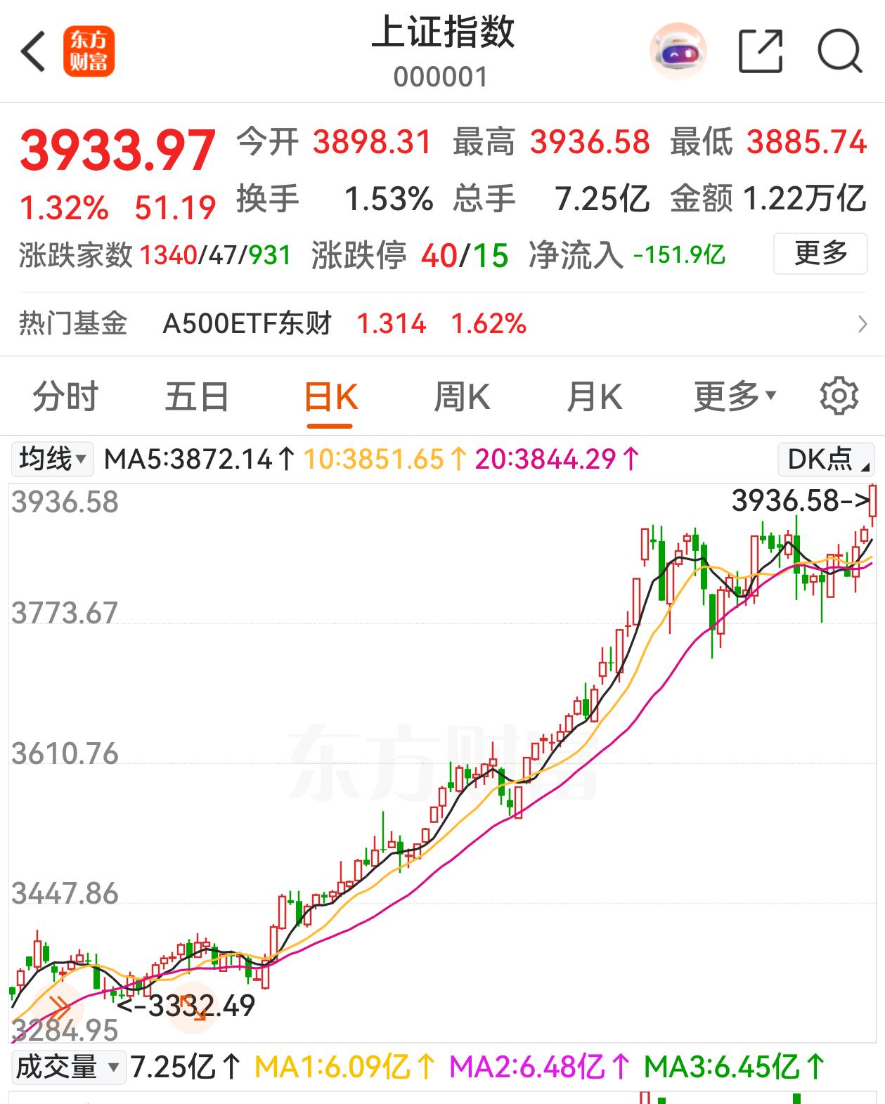 A股节后开门红,行情留下了浓墨重彩的一笔: ❖创下10年新高; ❖10月开门红; ❖上证突破3900点。 国庆长假外围市场表现活跃,股票、商品市场热点频出,在股民热切期待之中,A股红盘开盘,近期外围热点贵金属、半导体、核聚变、有色金属受到资金追捧,随着获利盘的涌出,指数出现下探,这时候大金融发力,指数得以企稳,资金流入有色、钢铁、煤炭、电力,久违的“煤飞色舞”启动,上证指数一举占上了3900点。 自8月25日以来,上证指数在3900点关前无功而返,指数就在3700—3900点之间徘徊,调整蓄势一个多月,今天突破3900意义非凡,如果回踩确认突破,则指数会在新的平台运行,破4000点不成问题。不过慢牛是本能行情的特征,不期望指数上涨过快是各方的期待,所以大盘是不会过快上涨的。今天早盘科技股活跃,大金融下跌,在大盘调整时大金融又发力托盘,在有色、煤炭、电力上涨后,大金融陷于了横盘,有资金结构调整的原因,也有有意控盘的迹象。 牛市进行时,上证站上新的台阶,板块热点带来赚钱效应还会很多。老美加大稀土、锂、铜等战略资源的投资,稀土、有色金属等成为大国博弈的焦点,现在黄金、小金属、银、铜、铝等都进入涨价周期,有色金属股受益,股价表现强势是有基础的。