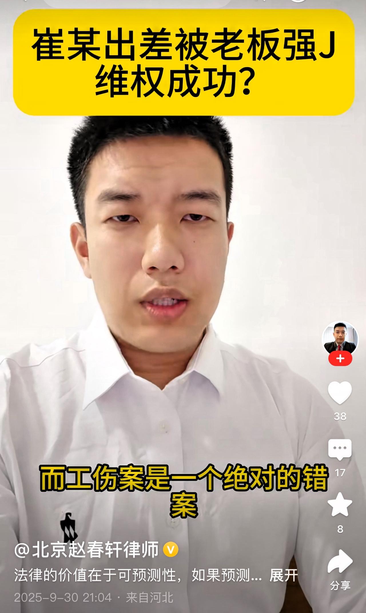 10月3号崔丽丽案赵春轩律师发声,原被告烽烟再起 赵春轩律师在自己的个人账号,针对崔丽丽案发声。 在9月30号.赵春轩律师的发声对于崔丽丽案件的性质极具颠覆性。 崔丽丽案件包含两部分,强jian案和工伤认定案。 赵春轩律师认为 一、强jian案是一个相对的疑案。 二、认定工伤案是一个错案。 在10月3号,赵春轩律师再次针对崔丽丽发声,称胜诉不代表有理。 并且表示不想与崔丽丽打网络口水战:如果你不再回应此事,我不再发表意见。 崔丽丽工伤待遇案已然引发了全社会的关注。 在接下来的崔丽丽工伤待遇案的审理中,原被告双方必须围绕工伤认定证据的特点,去寻找和固定证据,做到有法可依。 证据必须具备真实性、关联性、合法性。应能证明劳动关系、工伤事实及法定情形,确保证据链完整有效。 崔丽丽案将在法庭上举证质证,原被告双方向对方亮剑决胜负。