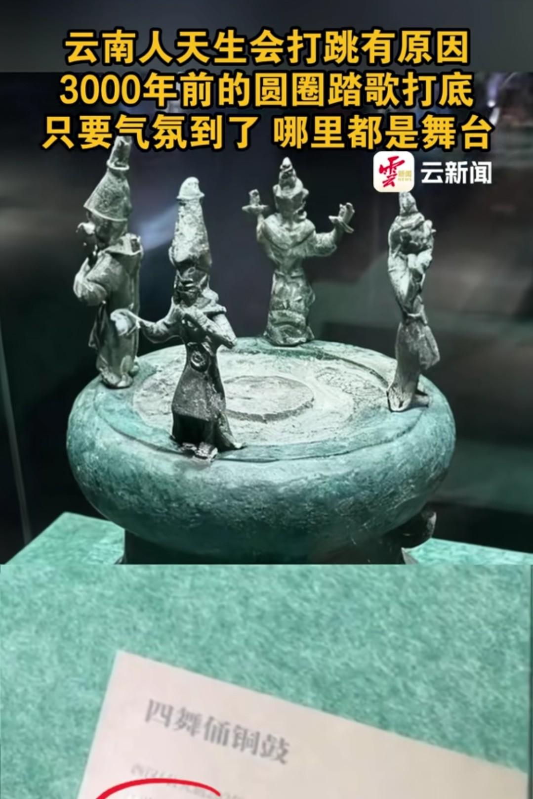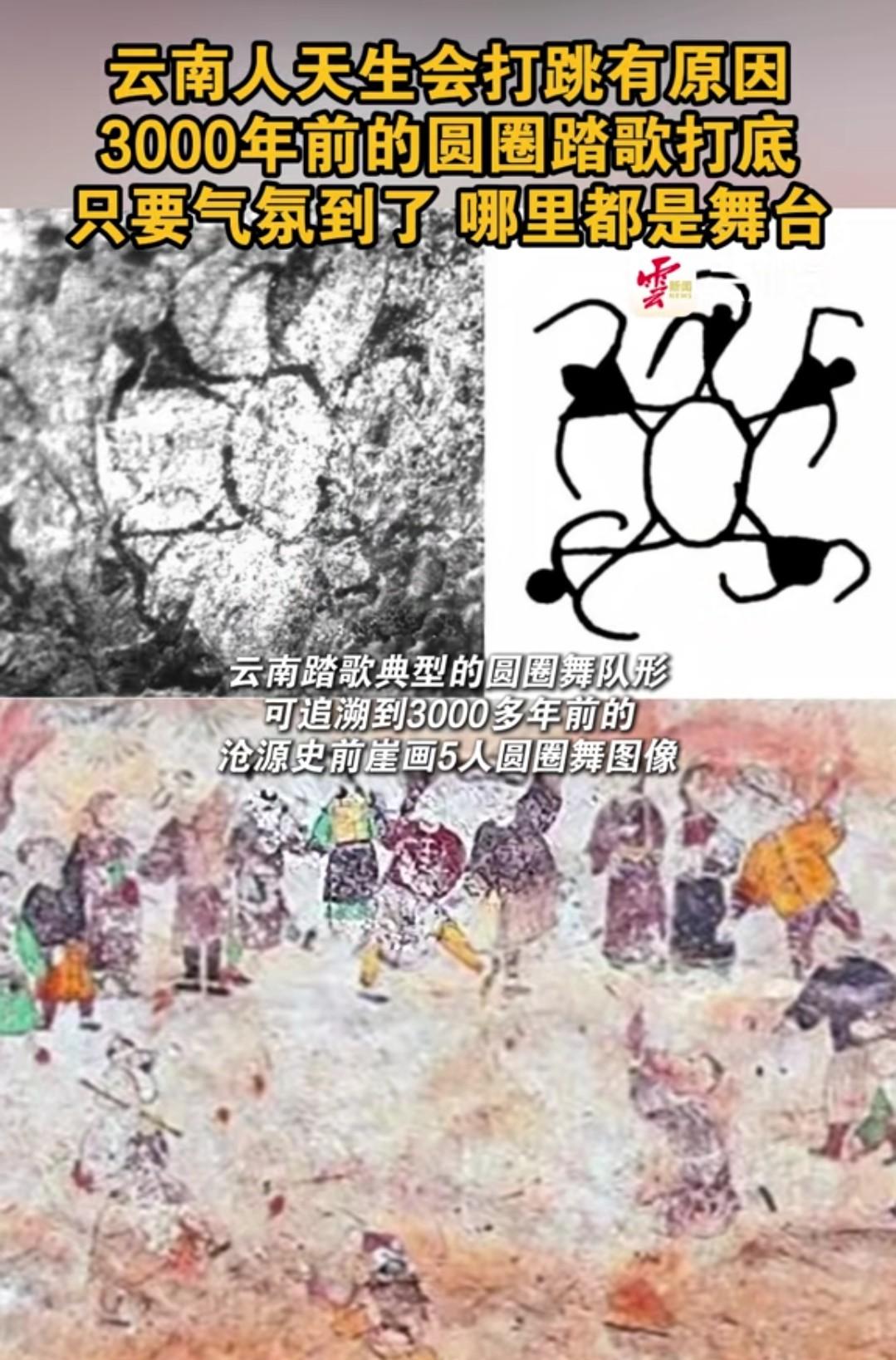 都说云南人天生爱打跳,喜欢围成圈跳舞,原来是有原因的,老祖宗三千面前也这样跳,气氛到了,哪里都可以是舞台。 沧源3000多年前的五人圆圈舞崖画、四俑舞铜鼓等等证据都证明了,云南人在久远的古代就是这样跳舞的。 果然是一方水土养一方人!