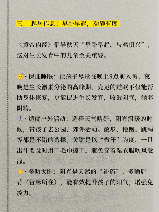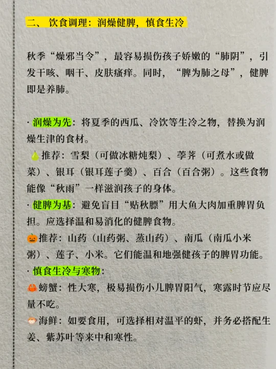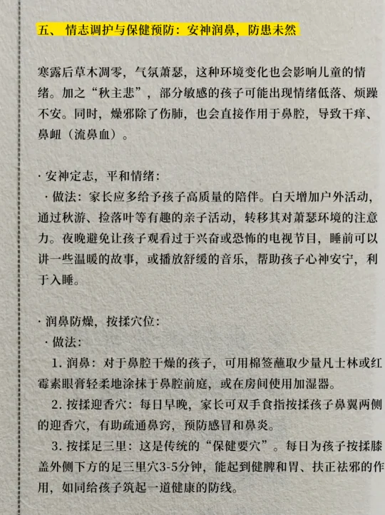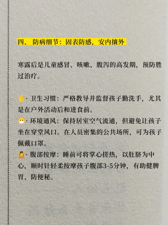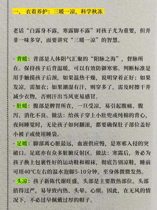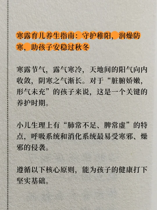 随着寒露节气的到来,天气逐渐转凉,空气也变得干燥。此时顺应自然变化,为孩子调整养护方式,有助于他们更好地适应季节转换。 1. 衣着有方:背暖、肚暖、足要暖 2. 饮食得当:温和滋润、慎食生冷 3. 作息规律:早睡早起,睡眠充足 4. 活动适宜:动静结合,及时擦汗 5. 情绪稳定:安心神,重陪伴 希望这份照顾指南,能助你陪伴孩子健康、安稳地度过这个美好的秋天。