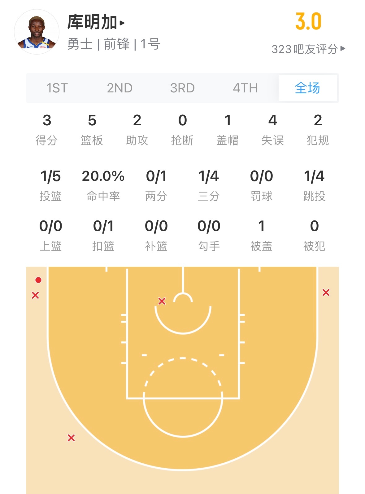 库明加18分钟,5中1,三分4中1,得到3分5板2助攻1盖帽4失误。还在防守?