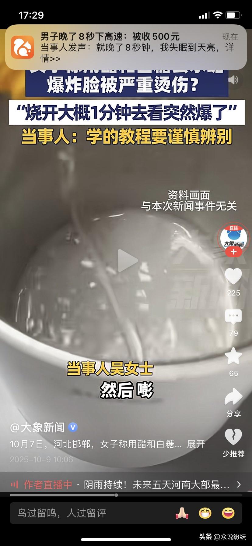 太危险了!河北一女子用醋和白糖去水垢导致脸部烫伤 2025年10月7日,一位河北邯郸的一位吴女士称:最近发现自己的暖水瓶里有许多水垢,于是,自己就在网上学习了一些去水垢的小妙招,她按照教程先用白醋和糖勾兑后放到锅里在火上烧开,然后倒倒保温壶里,停了大约1分钟后,她想看看水垢化了没有,淮知水知壶里的水就碰的一下浅见到自己的脸上,导致自己的面部严重烧伤。 吴女士提醒大家:真是太可怕了,看教程一定要谨慎辨别。