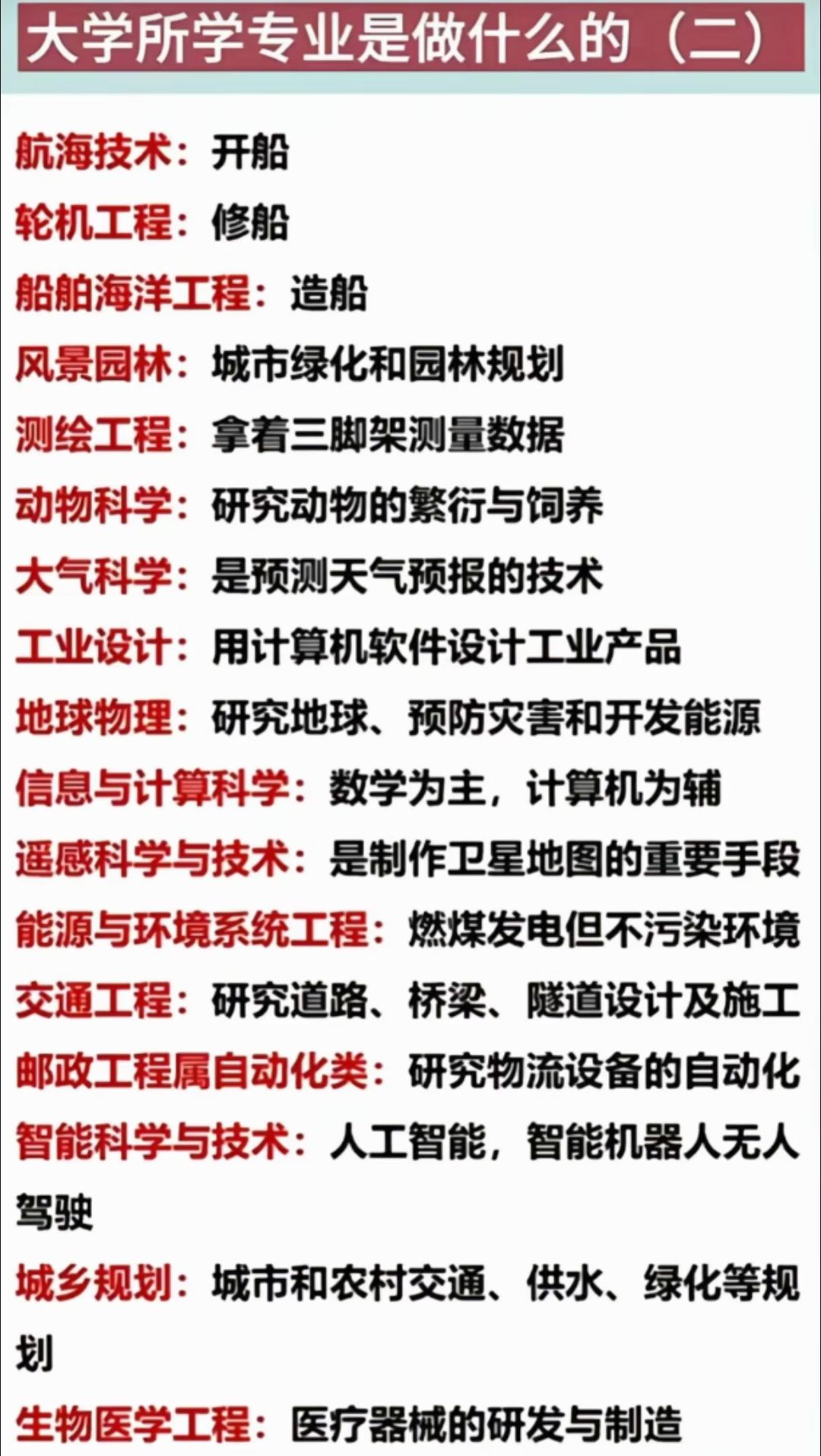 别再对大学专业一脸懵!这些专业到底是干啥的,看完你就懂了 填报志愿选专业时,你是不是也对着一堆专业名称犯迷糊?“审计学”和“会计”有啥不一样?“放射医学”是专门治肿瘤的?今天就来跟大家唠唠这些大学专业到底是做什么的,帮你把专业和职业的“匹配度”摸得清清楚楚。 先说说经管类专业。审计学可不是简单的“查账”,它是对企业、机构的财务状况、经营成果来个全方位“体检”,看看账目是不是真实合规,就像给财务系统当“侦探”。会计呢,是记账、算账,把企业的资金往来、经营情况用数据和报表理清楚,是企业财务的“大管家”。财务管理就更全面了,不仅要会会计的活儿,还得给企业做理财规划,让资金花得更值、赚得更多,是财务领域的“战略家”。 再聊聊医学类专业,那可太丰富了。口腔医学就是专门看牙的,从补牙、拔牙到牙齿矫正、种植牙,把你的牙齿打理得健健康康。临床医学是看各种病的,内科、外科、妇产科……哪里不舒服都能找临床医生。放射医学主要是用放疗等手段治疗肿瘤,给癌症患者带来希望。麻醉学是给病人打麻药,让患者在手术中感受不到疼痛,是手术顺利进行的“幕后英雄”。儿科学专门给小孩儿看病,因为孩子的身体和成人不一样,儿医得更有耐心和专业知识。护理学就是大家熟悉的护士,打针输液、照顾病人起居,是医院里无处不在的“暖心天使”。眼视光医学看眼睛疾病,近视、远视、青光眼都在它的范围内。精神医学是给有精神疾病的人看病,关注人的心理健康。医学影像学是看片子的,通过X光、CT、磁共振等影像给医生辅助诊断,是疾病的“透视眼”。预防医学不仅可以从事传染病科室的临床工作,还能做科研、在海关检疫岗位上守护国门健康,为公共卫生保驾护航。 教育类专业也很热门。小学教育就是培养小学老师的,语文、数学、英语……各科老师都从这里来,他们是孩子基础教育的“引路人”。学前教育是培养早教老师、幼儿园老师的,带着小朋友唱歌、跳舞、做游戏,开启孩子的启蒙之旅。 理工类专业更是五花八门。计算机科学与技术就是写代码,开发软件、做网站、搞人工智能,咱们日常用的APP、电脑程序好多都是他们做的。机械制造及其自动化是培养工程师的,设计、制造各种机械,小到手机零件,大到汽车、机床,都离不开他们。航海技术是开船的,远洋货轮、游轮的驾驶员就出自这个专业。轮机工程是修船的,保障船舶的动力系统、机械设备正常运转。船舶海洋工程是造船的,设计、建造各种船舶和海洋工程装备。风景园林是搞城市绿化和园林规划的,咱们逛的公园、城市里的绿化带,很多都是他们设计的。测绘工程是拿着三脚架测量数据,盖楼、修路都得先靠他们测好地形、距离。动物科学是研究动物的繁衍与饲养,让畜牧业更科学,也研究动物的习性。大气科学是预测天气预报的,咱们每天看的天气预报准不准,就靠他们的研究。工业设计是用计算机软件设计工业产品,从手机的外观到汽车的造型,都需要他们的创意。地球物理是研究地球、预防灾害和开发能源,地震预测、石油勘探都有他们的身影。信息与计算科学以数学为主,计算机为辅,是很多科技领域的“基石”。遥感科学与技术是制作卫星地图的重要手段,城市规划、农业监测都离不开它。能源与环境系统工程研究如何燃煤发电但不污染环境,在能源和环保之间找平衡。交通工程研究道路、桥梁、隧道设计及施工,让咱们的出行更顺畅。邮政工程属自动化类,研究物流设备的自动化,让快递分拣、运输更高效。智能科学与技术搞人工智能、智能机器人、无人驾驶,是未来科技的“先锋”。城乡规划是对城市和农村的交通、供水、绿化等进行规划,让咱们的生活环境更宜居。生物医学工程是研发与制造医疗器械的,从听诊器到CT机,都有他们的功劳。 还有一些其他专业也很有特色。法学专业的毕业生可以去法院、检察院当法官、检察官,也可以在公司做法务,还能当律师,维护公平正义。汉语言文学专业的可以当中小学语文老师,也能做文案策划、编辑,和文字打交道,把文字的魅力发挥出来。 说了这么多,你是不是对这些专业有了更清晰的认识?选专业的时候,可不能只看表面,得深入了解它的学习内容和就业方向。你当年选专业的时候,是因为啥选的呢?现在对自己的专业和职业还满意吗?专业排行 十大吃香专业 十大最好专业 大学专业 专业 十大冷门专业 财经专业排名