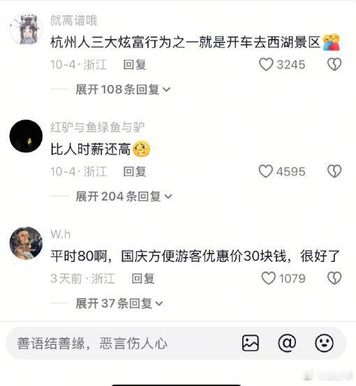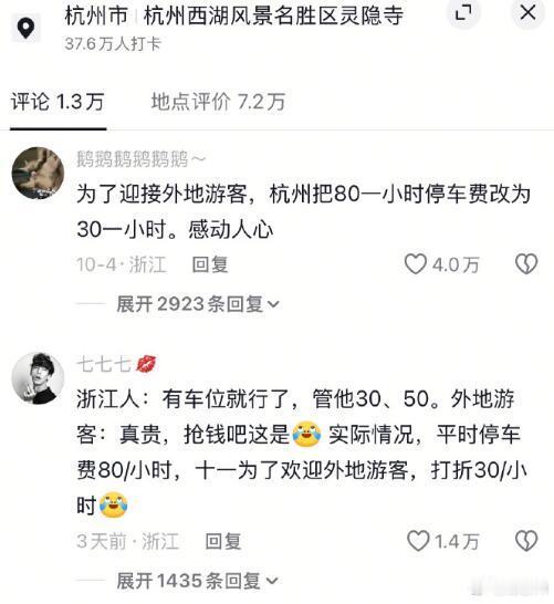 外地人去杭州,一个是吃西湖醋鱼,一个是去西湖停车场,都是大聪明操作。就算30元也是从80元降下来的,比很多当地人的时薪都高了。真就是到了节假日就可以坐地起价,难道就没人能管管?都说欢迎五湖四海来的游客,也不能用这么高的价格“招待”吧。