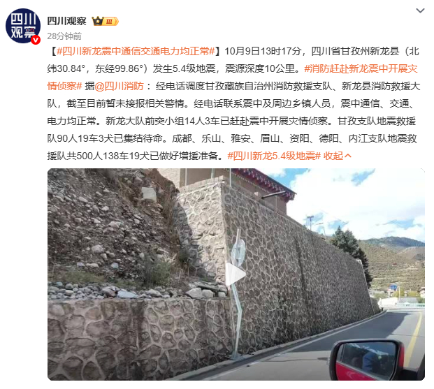 四川新龙5.4级地震10月9日13时17分,四川甘孜州新龙县发生5.4级地震,震源深度10千米。震中附近居民震感强烈,地面巨响持续二十多秒。
