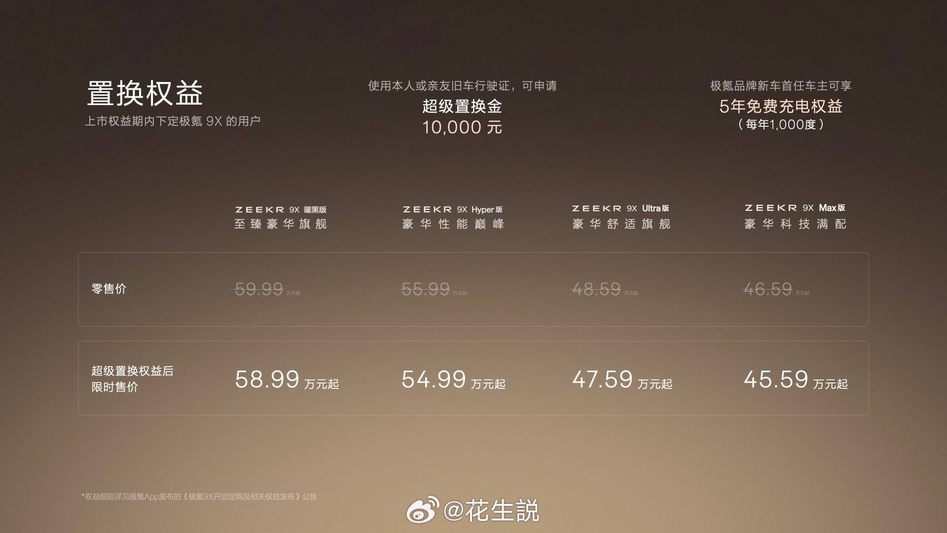 这次极氪9X一共有四个版本,售价从46.59万~59.99万,算上超级置换权益还有1万优惠,大家觉得香不香?