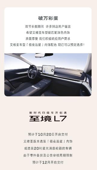 至境L7首批车主报告来啦,10天大定破1.2万台,看看符合不符合您的画像。几个好玩的点,接近50%用户选择了艾维亚版,还有一些从新势力和B级合资“跳槽”的用户。另外追加了个破万彩蛋,新增极夜追星新内饰,给40%喜欢深色内饰的用户一个新选择。新车10月20日开启交付,个别选装的顶配车型预计12月开始交付,小伙伴们耐心等等哈。【来自懂车帝车友圈】