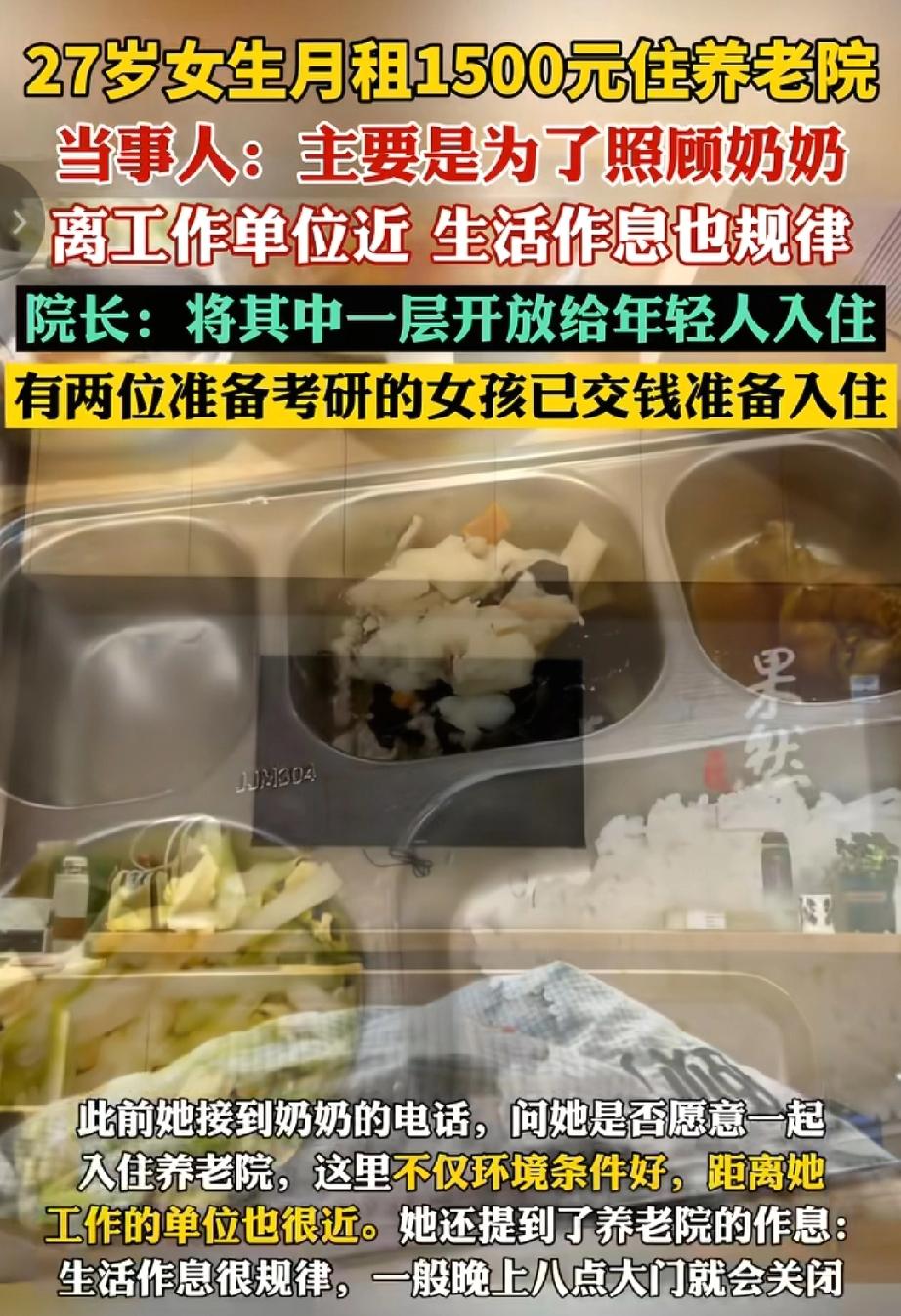 1500元/月包吃住,27岁女孩住进养老院,是精明选择还是无奈之举? 近日,浙江一位27岁的女生为了方便照顾奶奶,选择每月花费1500元,入住当地一家养老院,包吃包住的生活引发了网友的广泛热议。 有人称赞她“思路清奇”“会过日子”,也有人担忧这背后是否隐藏着年轻人的无奈与焦虑。 从表面看,这个选择确实有其合理性。对于刚步入社会、收入尚不丰厚的年轻人来说,1500元在浙江这样的经济发达地区,连一个单间的房租都未必够。 而入住养老院,不仅解决了住宿问题,还省去了一日三餐的烦恼,极大地降低了生活成本。 同时,女孩表示自己很喜欢和老人相处,能在工作之余陪伴他们,也算是一种精神上的慰藉。这种“以房养老”式的反向操作,似乎打破了传统的居住观念。 然而,在这看似“精明”的选择背后,也折射出一些现实问题。首先是职业发展的局限性。长期在养老院工作,可能会限制个人的职业成长和社交圈子的拓展,对于27岁的年轻人来说,这是否是长久之计值得深思。 其次是生活质量的平衡。养老院的生活环境和作息安排,与年轻人追求的个性化、多元化生活方式可能存在一定差距。 长期处于这样的环境中,是否会感到压抑或不适应,也是需要考虑的因素。 这件事之所以能引发关注,本质上是因为它触及了当代年轻人面临的共同困境——高房价、高生活成本下的生存压力。 女孩的选择,既是对传统居住模式的一种创新尝试,也可能是在现实压力下的一种无奈妥协。 每个人的生活选择都应得到尊重,毕竟适合自己的才是最好的。 但同时,我们也需要思考,如何才能让年轻人在追求梦想的道路上,不必为基本的生活保障而过度焦虑。 1500元入住养老院,这个看似小众的选择,其实是当代年轻人生活压力的一个缩影。 它提醒我们,在关注经济发展的同时,更要关注年轻人的生存状态,为他们创造更加友好、包容的社会环境。 无论如何,这位浙江女孩的勇气值得肯定。她用自己的方式诠释了生活的另一种可能,也让我们看到了年轻人在困境中寻找出路的智慧。 你问我答美丽浙江 工作 养老