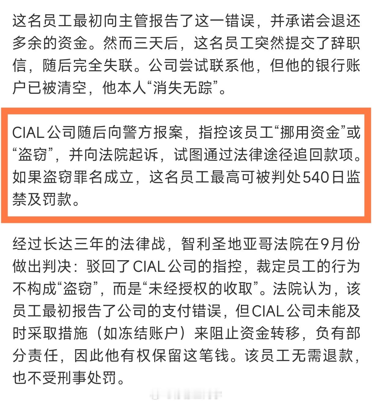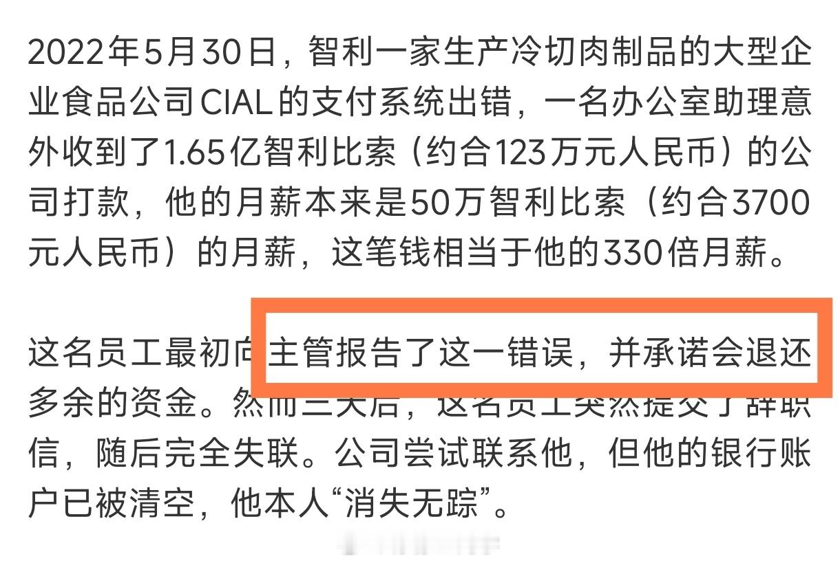 智利公司错发123万工资员工被判不退款这个新闻疑点还挺多的…