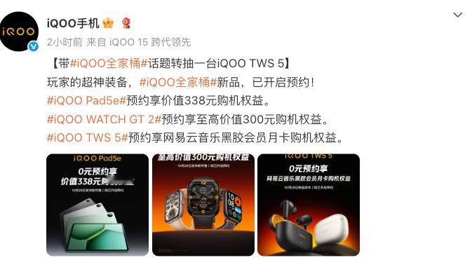 建议大家可以先预约上,有福袋优惠羊毛薅,等发布了马上就能下单入手,因为发布会结束就直接开售[并不简单]。对了~这次还有新品「全家桶」iQOO Pad5e、iQOO WATCH GT 2、iQOO TWS 5等等,同样也是预约就有优惠权益,和新品旗舰一起买估计还有福利,推荐也一并预约上再说![点赞][666]