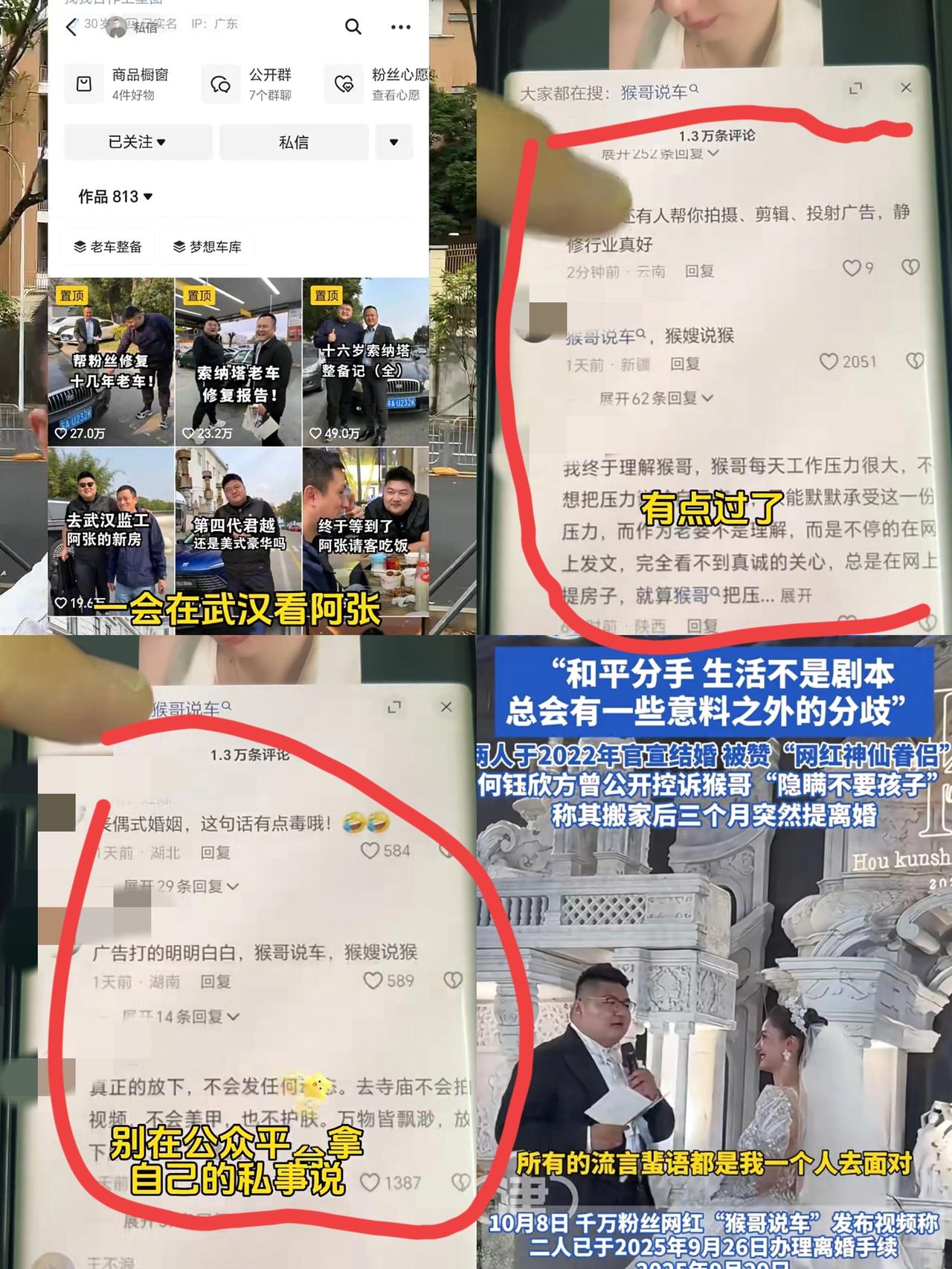 终于明白 猴哥说车为啥坚持离婚了 不是因为受够了何小姐,也不是因为不再爱她了 而是因为猴哥觉得自己破产了,不能再给她幸福了。网上针对猴哥和何小姐离婚的事闹得沸沸扬扬,说这么的都有。 但是单单从猴哥角度看,好像离婚并不是最坏的选择。 一、他破产了,再也承担不起何小姐的幸福了。 二、两人的意见不一致,相处起来可能很累。 不过猴哥整件事情过后并没有发布任何声明以及后续。反观何小姐,离婚后续不断,称自己遇到丧偶式离婚,这个标题如果细细品味确实有些过了。 不过呢,清官难断家务事!缘分这东西谁说的清楚呢?还有家丑不可外扬,他们的这些举措多少有一些炒作博眼球得嫌疑了,你说呢?