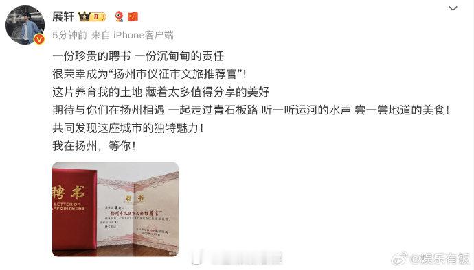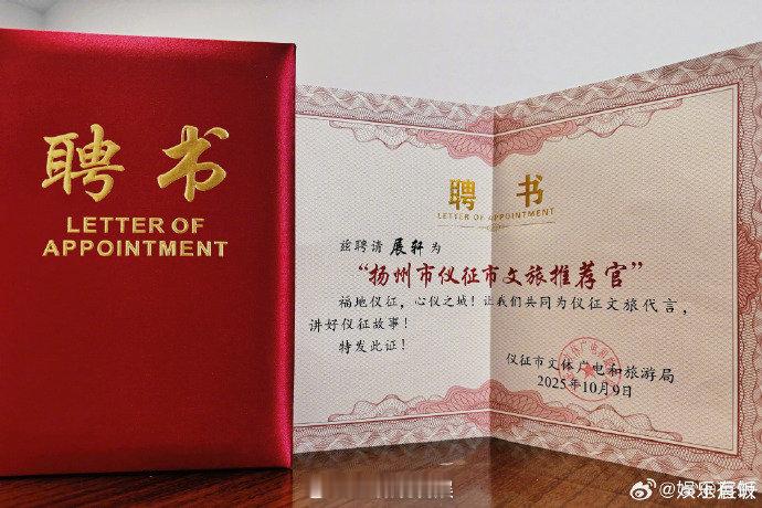 展轩官宣扬州市仪征市文旅推荐官展轩晒仪征市文旅颁发的聘书 仪征市的小骄傲正式官宣为扬州市仪征市文旅推荐官啦[期待期待有机会偶遇展轩~