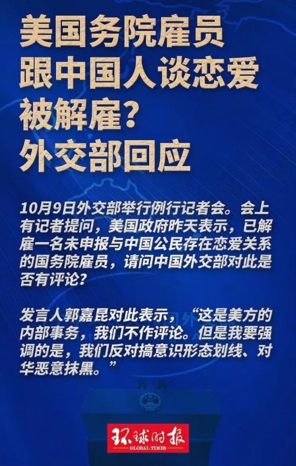 美解雇未申报与中国公民谈恋爱雇员美国因未申报恋爱解雇雇员的举动,看似维护安全,实则代价沉重。这种做法将所有中美民间交往预设为风险,是对互信基础的严重破坏。中方明确反对此类意识形态划线行为 ,正是看到其危害——当跨国情感都被贴上“可疑标签”,当正常社交需层层报备,国家间的民间纽带便会被割裂,最终让对抗思维陷入自我强化的怪圈。