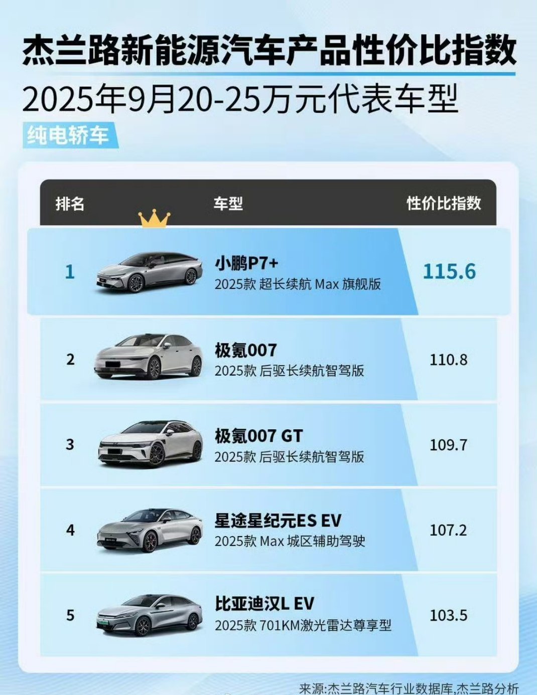 而且在杰兰路最新发布的新能源性价比指数里,小鹏P7+还拿下了同级冠军,怪不得这么多年轻家庭都选它!小鹏P7+连续10个月蝉联销冠大v聊车