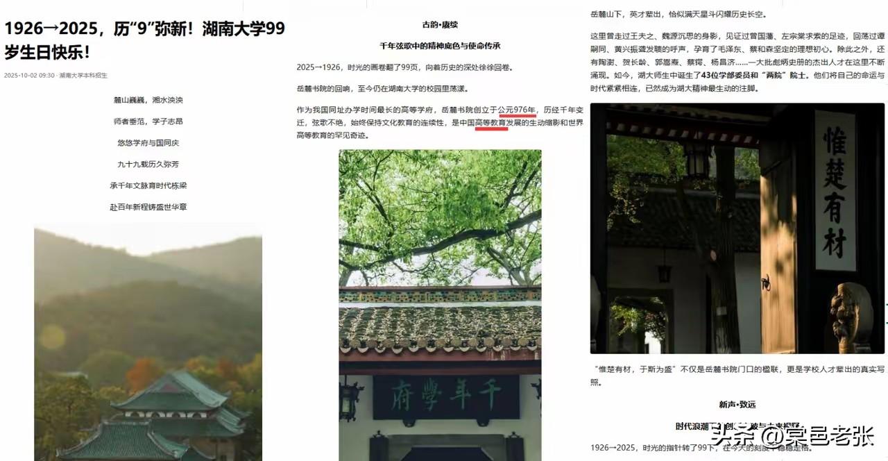 10月2日,众人都在为天津大学130岁生日送上祝福,湖南大学也迎来99岁诞辰。官网标题着重突出“99岁(1926→2025)生日快乐”,但文中却不经意间提到“岳麓书院创立于976年……是中国高等教育发展的生动缩影和世界高等教育的罕见奇迹”。