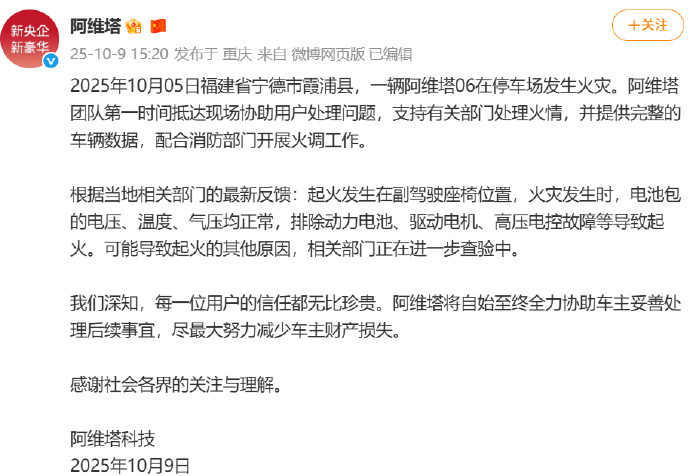 10月9日,阿维塔官方发布声明:2025年10月5日福建省宁德市霞浦县,一辆阿维塔06在停车场发生火灾。阿维塔团队第一时间抵达现场协助用户处理问题,支持有关部门处理火情,并提供完整的车辆数据,配合消防部门开展火调工作。