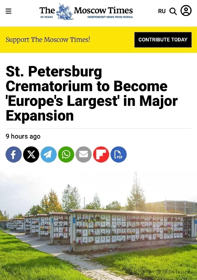 《莫斯科时报》报道称,因为在乌克兰的严重损失,圣彼得堡火葬场即将成为欧洲最大的火葬场,该项目耗资2.07亿卢布,计划在安装6台捷克Tabo火葬炉后,火葬炉总数将达到20台,每天最多可以火化240具遗体。