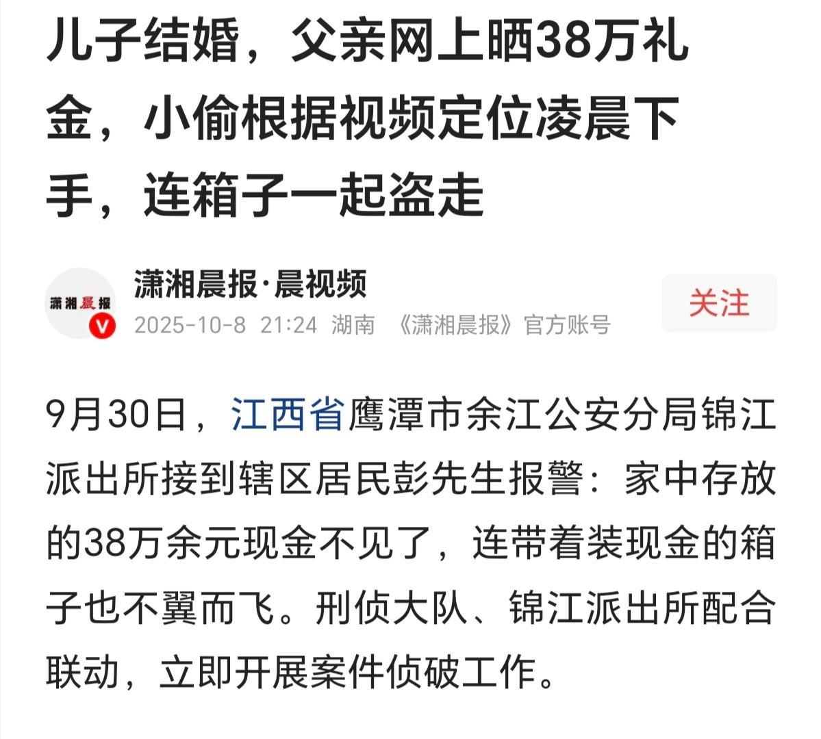 江西余江,男子给儿子操办婚礼,一高兴随手发了个朋友圈,晒满满一箱子礼金,没想到被人盯上,小偷仅通过视频里的一句话,用地图直接搜索到主家,乔装打扮把刚收的38万礼金一锅端。那可是亲朋好友的份子钱,还有儿媳妇的嫁妆都在里面,男子不敢耽搁,赶紧报警。小偷很快被锁定,事后小偷后悔不已,称一看箱子里的钱数,就知道这回准栽了! 彭先生家有喜事,儿子大婚,他按耐不住心中的喜悦,随手发了个朋友圈。 没想到,就因为这一条短视频,就被人惦记上,刚给儿子办完喜酒,家里一箱子现金就不翼而飞。 这可不是一笔小钱,足足有38万!里面既有亲戚朋友随的份子钱,也有儿媳的陪嫁和老两口准备的见面礼。 儿子新婚的喜悦劲还没过,就被这突如其来的闹心事搅的没了心气,一家人愁的吃不下饭,睡不着觉。 谁能想到,这场飞来横祸,竟是彭先生随手发的一条短视频引起的。 他本想分享家里办喜宴的热闹场面,可视频里有人喊了句"铁山彭总",就因为这句话,引起不法分子的惦记。 这真是应了那句老话,不怕贼偷,就怕贼惦记。你无心的一个举动,就会引狼入室。 当彭先生一家发现钱没了,当时就不淡定,首先怀疑的是亲戚朋友。毕竟知道钱在哪儿的,都是自家人。 可转念一想,这些都是知根知底的熟人,人品都信得过,实在没法往他们身上想。 就在他们焦头烂额的时候,有人提醒了一句:婚礼上那么多人,鱼龙混杂,保不齐有外人混进来。 彭先生思来想去,觉得很有可能,赶紧报了警。 现在哪哪都是监控,警察很快就从录像里锁定了一个可疑的人,此人竟然也姓彭。 嫌疑人彭某好吃懒做,没事刷手机,无意间看到彭先生发的短视频,结婚场面热闹隆重。 一看就是家境殷实,光礼金就满满一箱子,视频中还有人喊了一嗓子,铁山彭总。 这一下更引起他的注意,发现了商机,这下又可以发笔横财。 他立马就用手机地图搜了搜,轻松找到了彭先生家。 更气人的是,他还提前去踩了点,知道婚礼期间家里乱,钱没人看。 于是他乔装打扮,趁大家忙着招待客人,他就溜进去把钱箱子抱走了。 这彭某可不是头一次,可以说是轻车熟路,他交代说,以前用这招偷过两次,都是三万两万。 失主丢了钱,都嫌麻烦或者怀疑熟人,一般不会报警,两次都有惊无险,他胆子越来越大。 可这次他打开箱子一看,整整齐齐38万!他自己心里就打起鼓,感觉这次肯定要栽。 事后,他有些后悔,害怕被发现,不敢把这么多钱藏在家里,偷偷藏在他老婆的店里。 果不其然,天网恢恢,疏而不漏。他自以为聪明,结果还是被警察逮个正着。这真是“多行不义必自毙”。 《刑法》第264条:盗窃公私财物,数额较大的,或者多次盗窃、入户盗窃、携带凶器盗窃、扒窃的,处三年以下有期徒刑、拘役或者管制,并处或者单处罚金;数额巨大或者有其他严重情节的,处三年以上十年以下有期徒刑,并处罚金;数额特别巨大或者有其他特别严重情节的,处十年以上有期徒刑或者无期徒刑,并处罚金或者没收财产。 嫌疑人彭某见财起意,看人家办婚礼,就惦记上礼金。 通过地图搜索找到彭先生家,乔装打扮后潜入家中偷走38万现金,其行为属于入户盗窃。 根据法律规定,盗窃30万元以上属于“数额特别巨大”,彭某盗窃金额远超此标准,可能面临十年以上有期徒刑或无期徒刑。 《关于办理盗窃刑事案件适用法律若干问题的解释》第3条:二年内盗窃三次以上的,应当认定为多次盗窃。非法进入供他人家庭生活,与外界相对隔离的住所盗窃的,应当认定为入户盗窃。 彭某的行为同时满足“多次盗窃”和“入户盗窃”两个加重情节。 首先,彭某交代曾用类似手法盗窃两次,加上本次,属于多次盗窃。 其次,其潜入彭先生家中实施盗窃,而住宅属于供他人家庭生活,与外界相对隔离的住所,故构成“入户盗窃”。 这两个情节均不要求盗窃数额,一旦构成,无论盗得财物多少,都应依法追究刑事责任,并且应该从重处罚。 一场本应喜气洋洋的婚礼,就因为一条朋友圈,38万礼金不翼而飞。 如今网络时代,一句无心的称呼,一场热闹的婚礼,豆成了不法分子精准定位的线索。 这提醒我们,分享生活虽好,但一定要守住隐私的底线,尤其是涉及家庭住址、财务状况等敏感信息时,必须格外谨慎。 彭某心存侥幸,以为利用他人的疏忽就能屡屡得手。 然而,天网恢恢,疏而不漏,他的行为最终还是受到了法律的严惩。 这再次证明,任何试图挑战法律底线的行为,都必将付出沉重的代价。 在数字时代,我们每个人都像是生活在一个半透明的玻璃屋里,任何细微的举动都可能被无限放大。 生活中我们既要保护好自己的隐私,不给不法分子可乘之机。 @静心法谈 学法辨是非,慬法不吃亏。