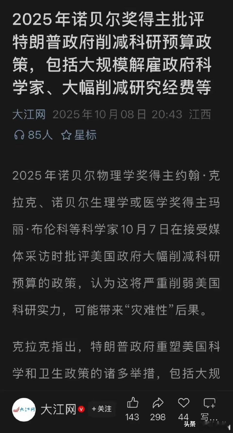 诺贝尔物理学奖为什么颁给他们仨2025年美国诺贝尔奖得主,不感谢国家,不感谢政府,相反,对特朗普政府进行了严厉批评,认为削减科研预算政策,包括大规模解雇政府科学家、大幅削减研究经费等,这样下去,美国科技是灾难性的损失……热点观点