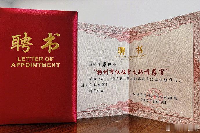 展轩官宣扬州市仪征市文旅推荐官展轩晒仪征市文旅颁发的聘书 仪征市的小骄傲正式官宣为扬州市仪征市文旅推荐官啦[期待] 好棒~