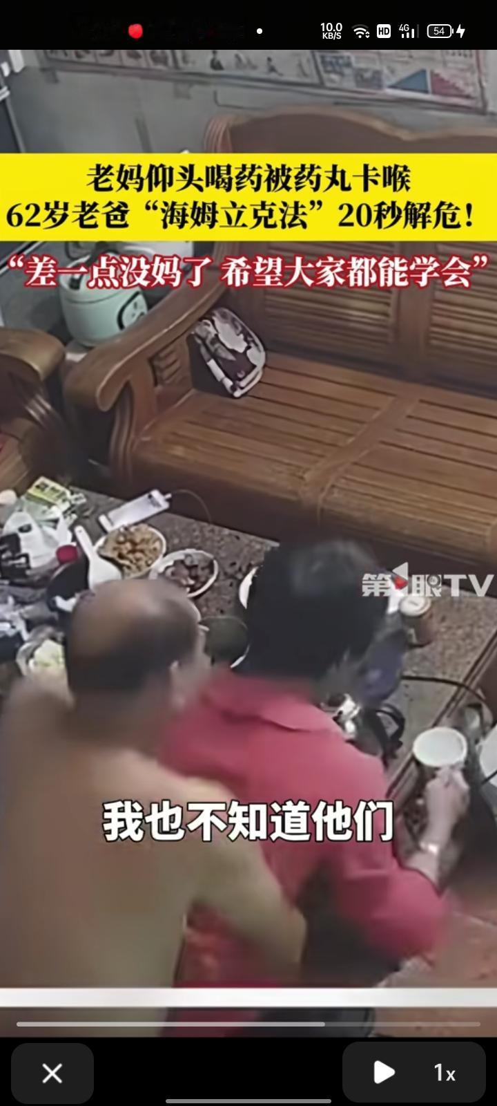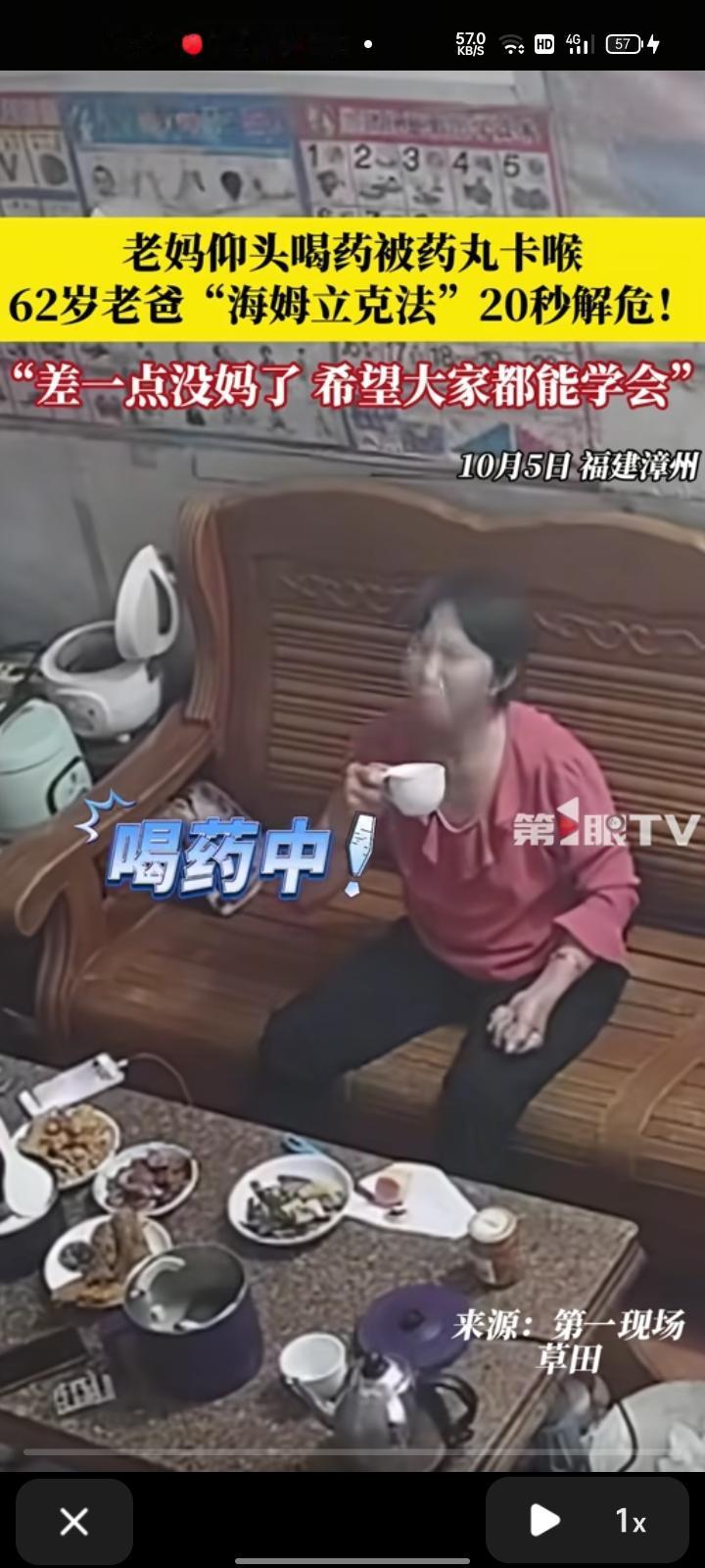 10月5日,漳州市云霄县。大娘仰头喝药被药丸卡喉,找丈夫求救,丈夫秒懂,用海姆立克法“抢”回一命。女儿张女士称,父亲是刷视频学的,不知道他们怎么突然就会了,希望大家都能学会,关键时刻能救命。